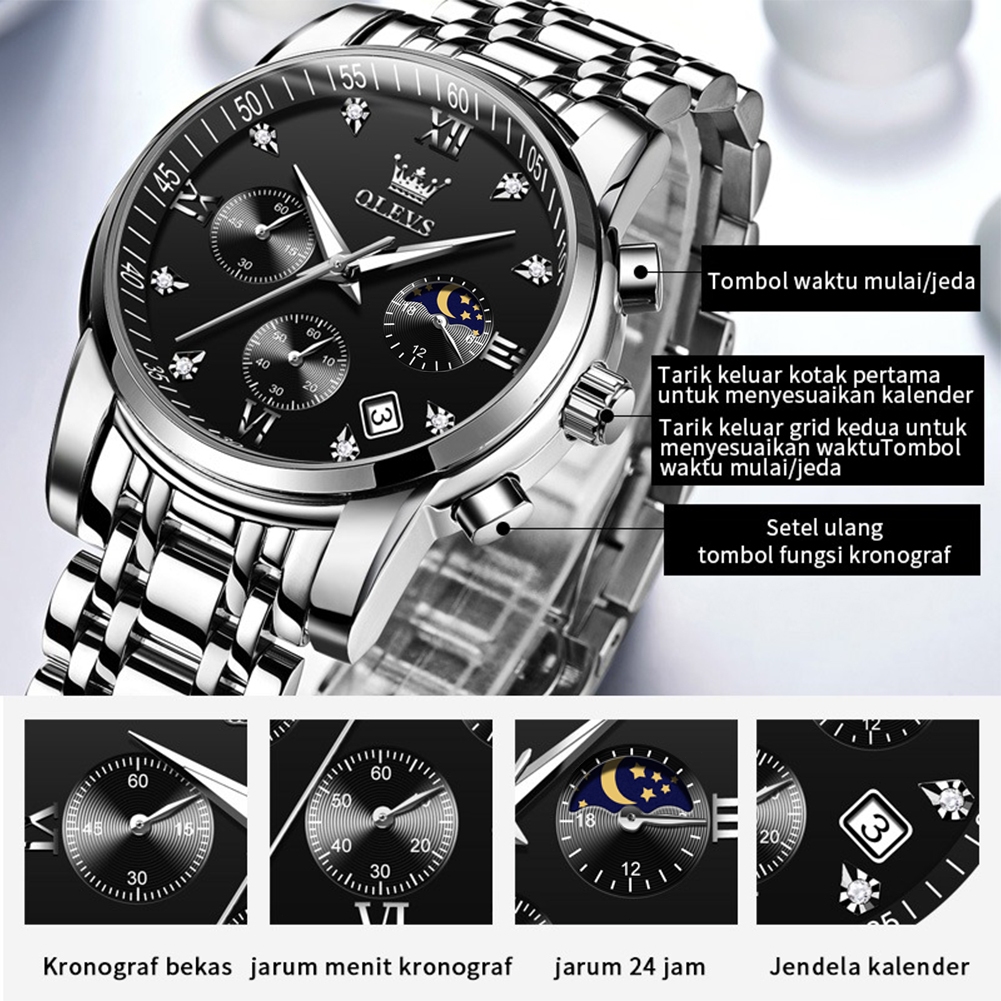 Olevs Jam Tangan Pria Anti Air Original Stainless Steel Chrono Aktif Cowok Luminous Kalender Analog Men Watch Mode 2858