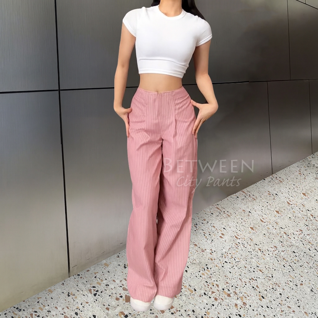 Betweeen - Stripe Pants Celana Panjang Wanita Wideleg City Pants Motif Salur Belakang Karet Celana Kulot Celana Kerja Ha