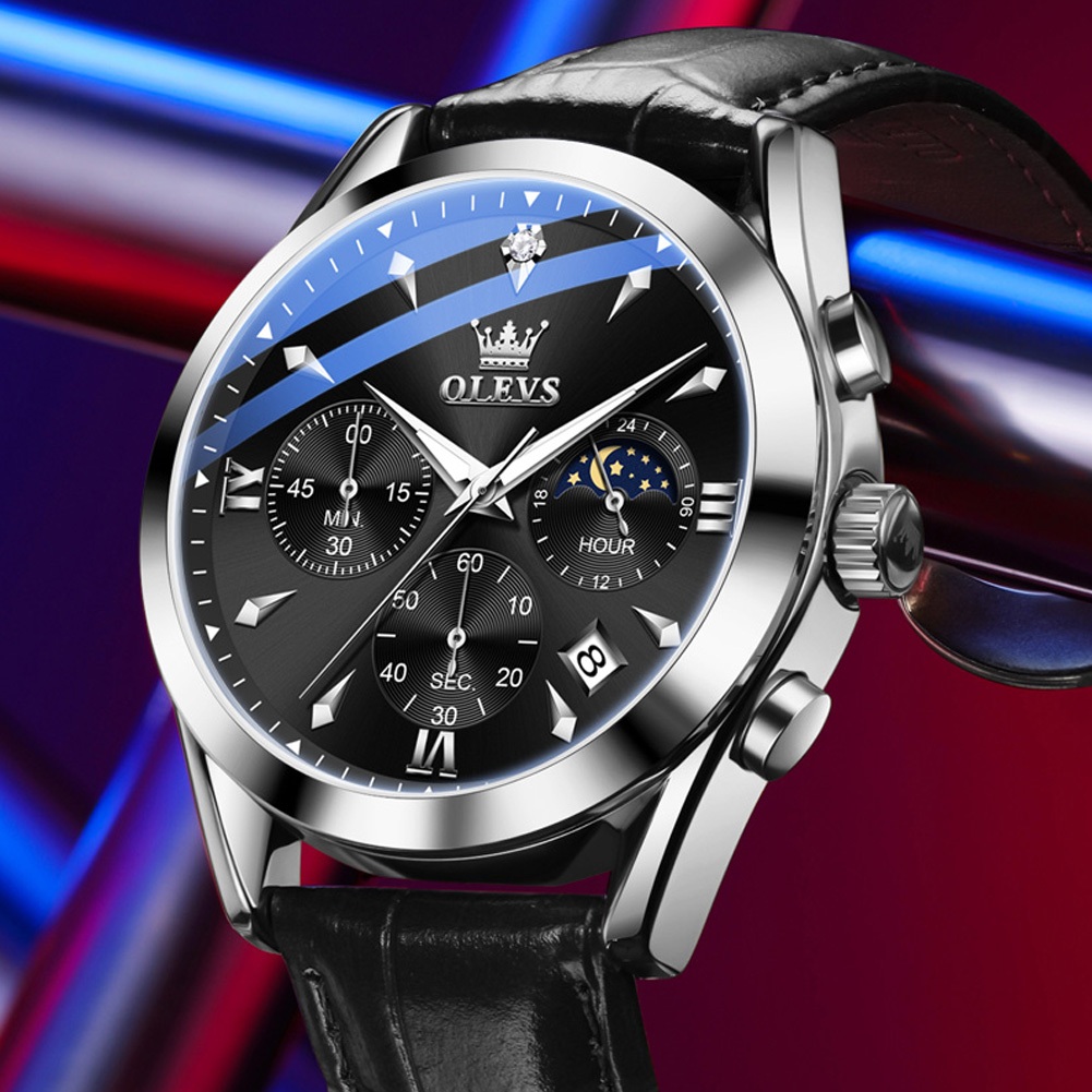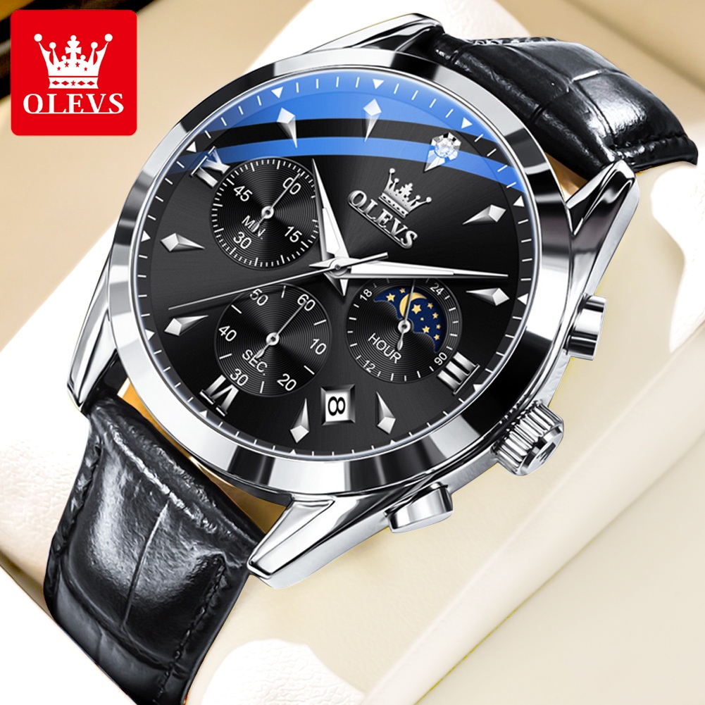 Olevs Jam Tangan Pria Original Anti Air Kulit Tahan Keren Hitam Coklat Luxury Chronograph Watch Men