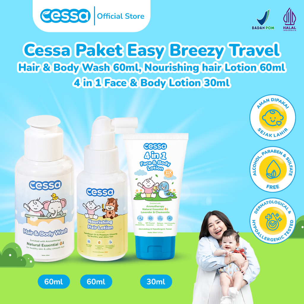 Cessa Paket Easy Breezy Travel - Hair & Body Wash 60ml + Nourishing hair Lotion 60ml + 4 in 1 Face & Body Lotion 30ml