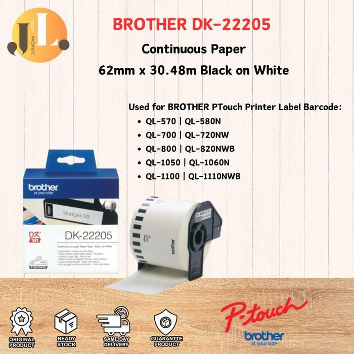 Brother DK-22205 Continuous Paper Roll 62mm x 30.48m Hitam Putih untuk Printer PTouch QL Series