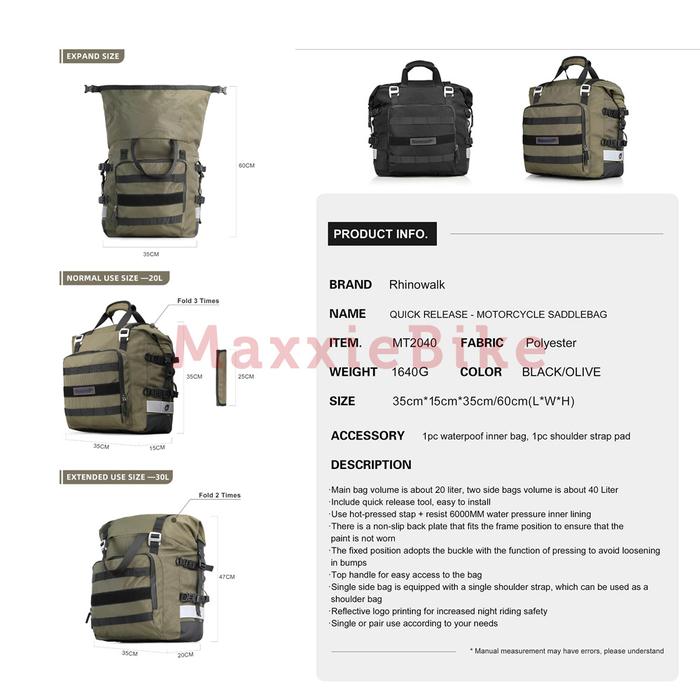 RHINOWALK MT2040 Tas Sepeda Motor 20L Motorcycle Side Bag Pannier Waterproof Travel Bag Ransel
