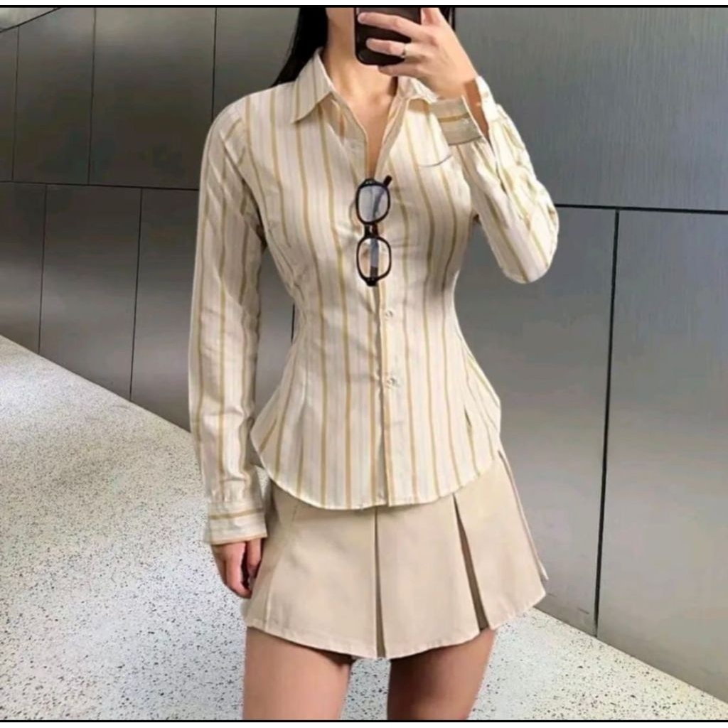 Monney Fitted Shirt Kemeja Slim Motif Stripe Kemeja kerja wanita fit garis stripe karet Lembut pink hijau biru Murah Gra