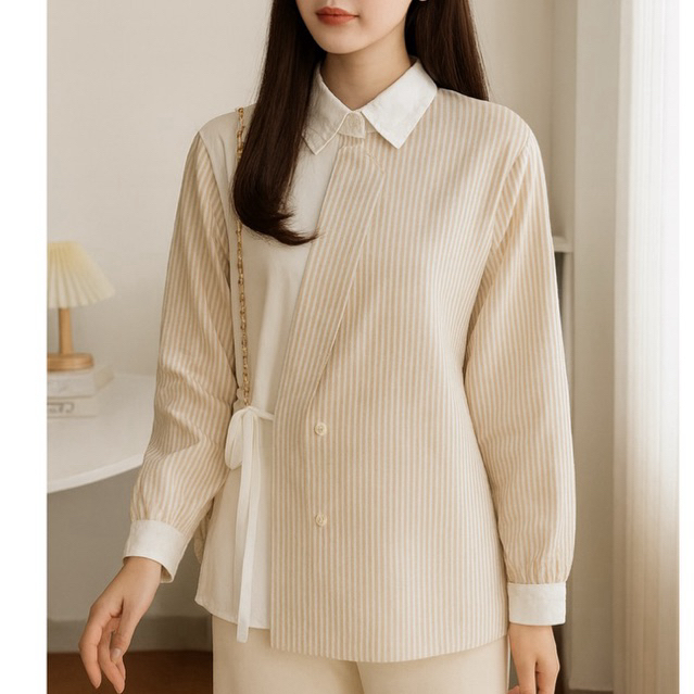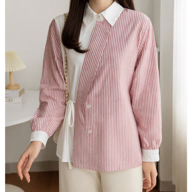KANZA Kemeja Kombinasi Motif Salur Lengan Panjang Murah Gratis Ongkir