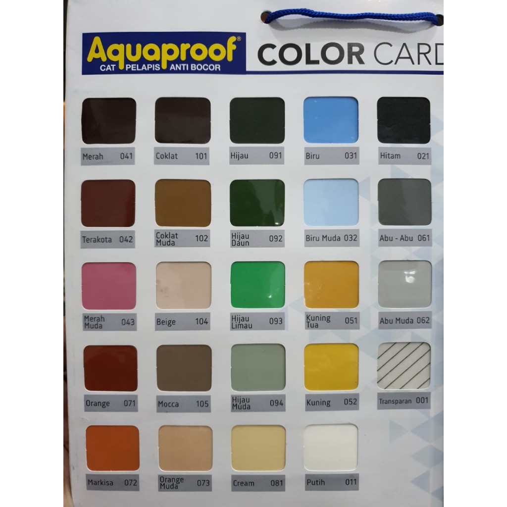 abu muda 062, abu lava 063, abu abu 061, abu grafit 064, putih 011, off white 012, beige 104, sandstone 106, mocca 105, cream 081, hitam 021, coklat 101, terakota 042, merah 041, merah delima 045, orange 071, trans 001, biru 031, biru muda 032, hijau 091, hijau daun 092, hijau limau 093, hijau md/sage gr 094, aquastop abu, aquastop putih