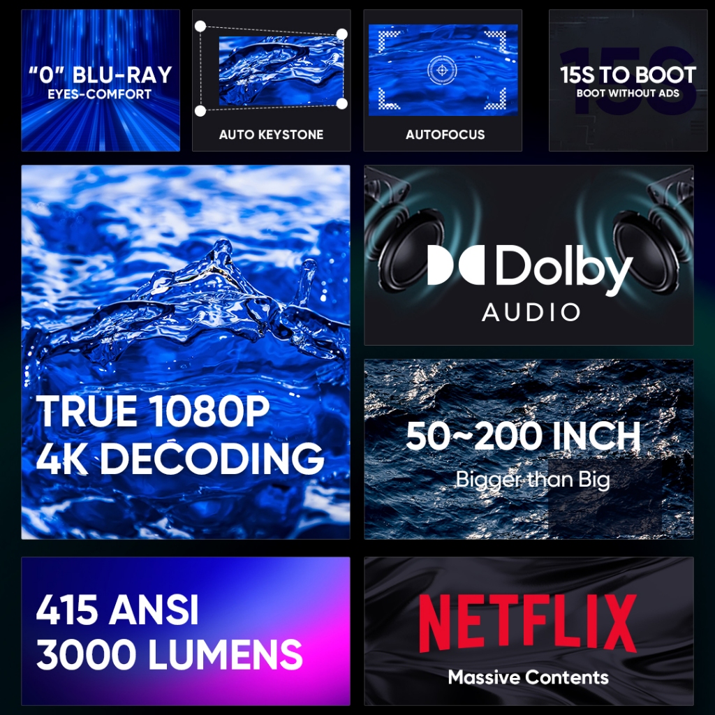 EROC Smart Proyektor LCD 415 ANSI Full HD Android 12 Dolby Audio Display 200 Inch Auto Focus -MAX