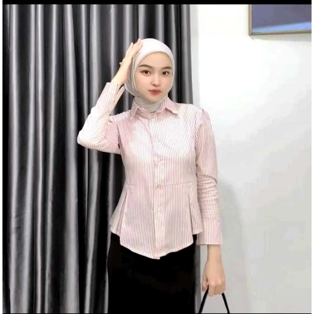 Blouse Stripe Rempel Korean Look Fitted Shirt - Atasan Wanita Stripe Salur - Kemeja Wanita Kantor Formal Casual Murah Gr