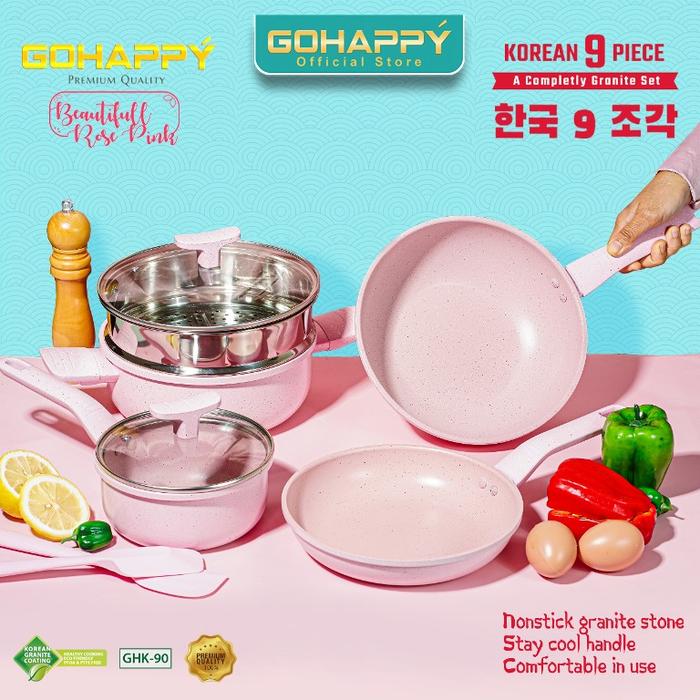 Panci 1 Set Lengkap Gohappy Panci Set Korean 9 piece - Beautiful Pink granite -