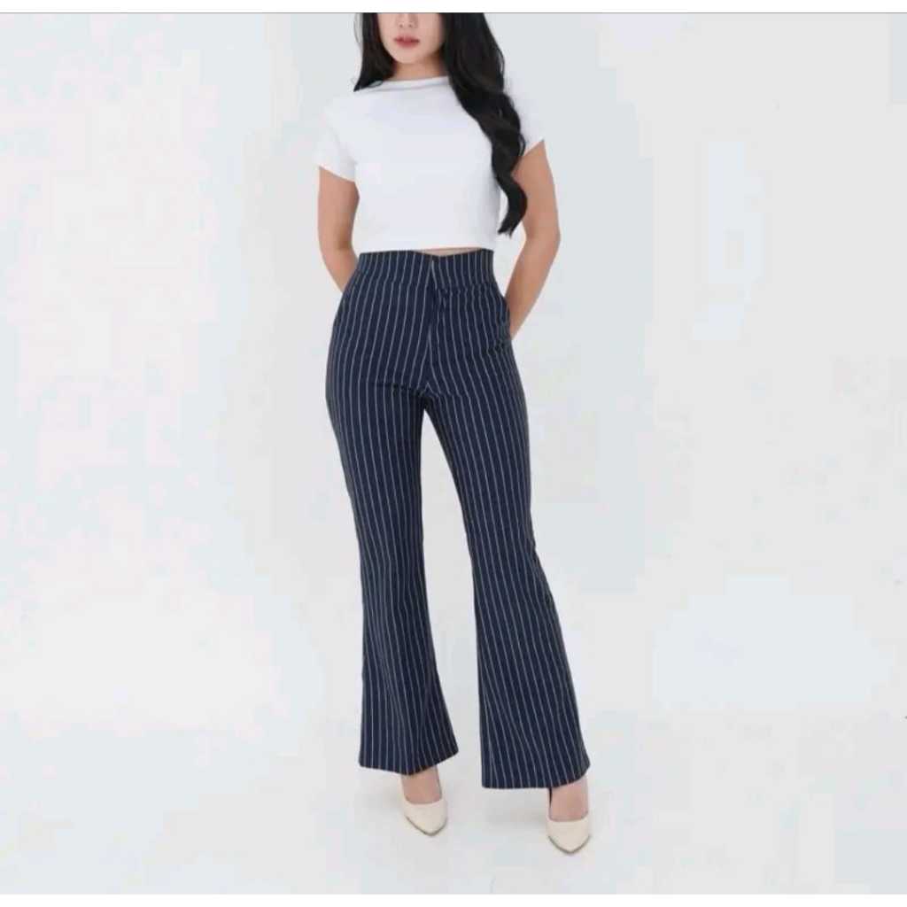 Flare Pants Stripe Bangkok - Celana Semi Cutbray Knit Premium - Cutbray Highwaist Pants - Celana Wanita Semi Cutbray Mur
