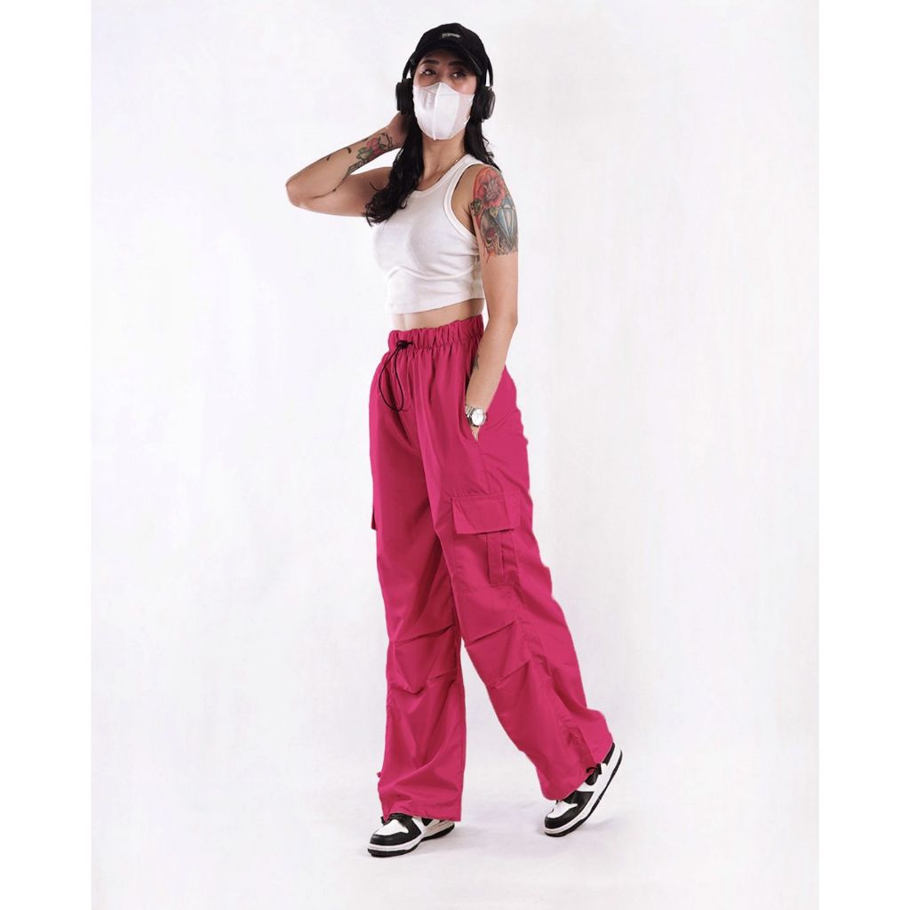 AIGO baggy cargo pants - celana cargo parasut panjang pink streetwear korean style unisex