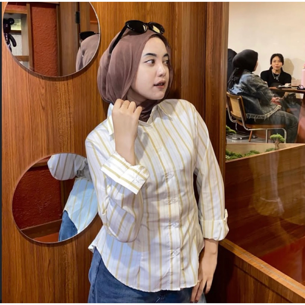 Nouna Girls Boss Fitted Shirt Kemeja Kerja Wanita Fit Garis Stripe Karet Lembut Pink Hijau Cream Murah Gratis Ongkir
