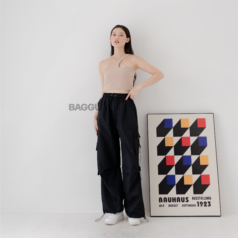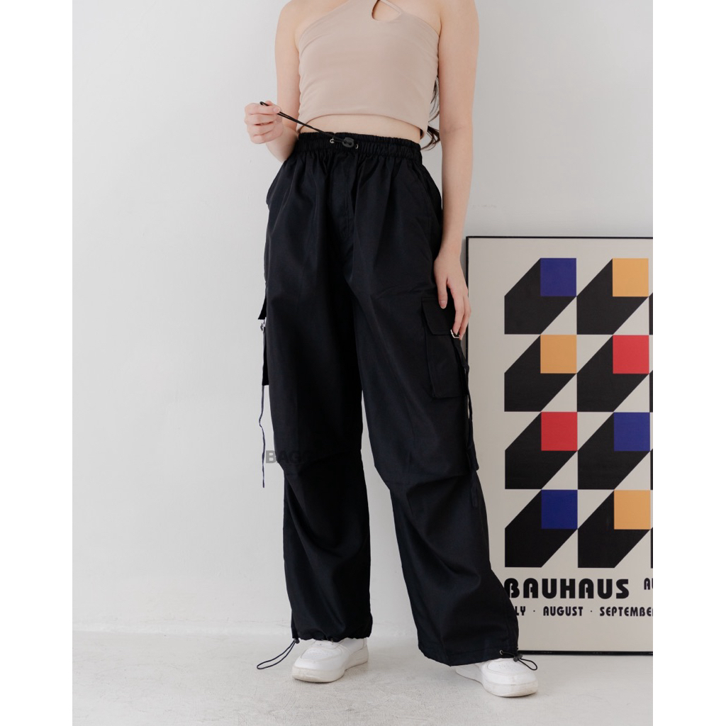 BAGGU Cargo Pants Jennie - BLACK - Celana Cargo Nylon Parasut Panjang Loose Pants StreetWear Korean Style Unisex