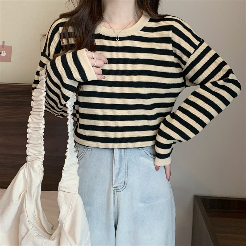 TP22 Atasan Rajut Wanita Motif Belang Atasan lengan Panjang Rajut Korean Top Wanita Motif Salur Murah Gratis Ongkir