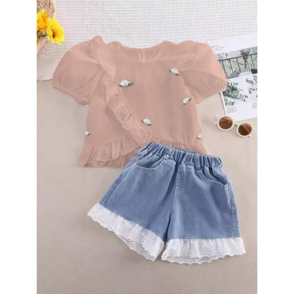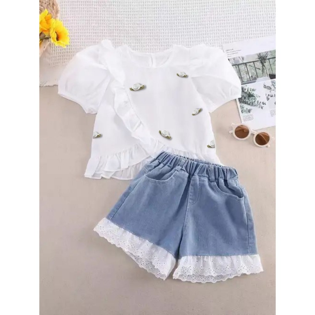Setelan Anak Perempuan Cantik 1-5 Tahun Blouse Bunga Dan Celana Denim Renda