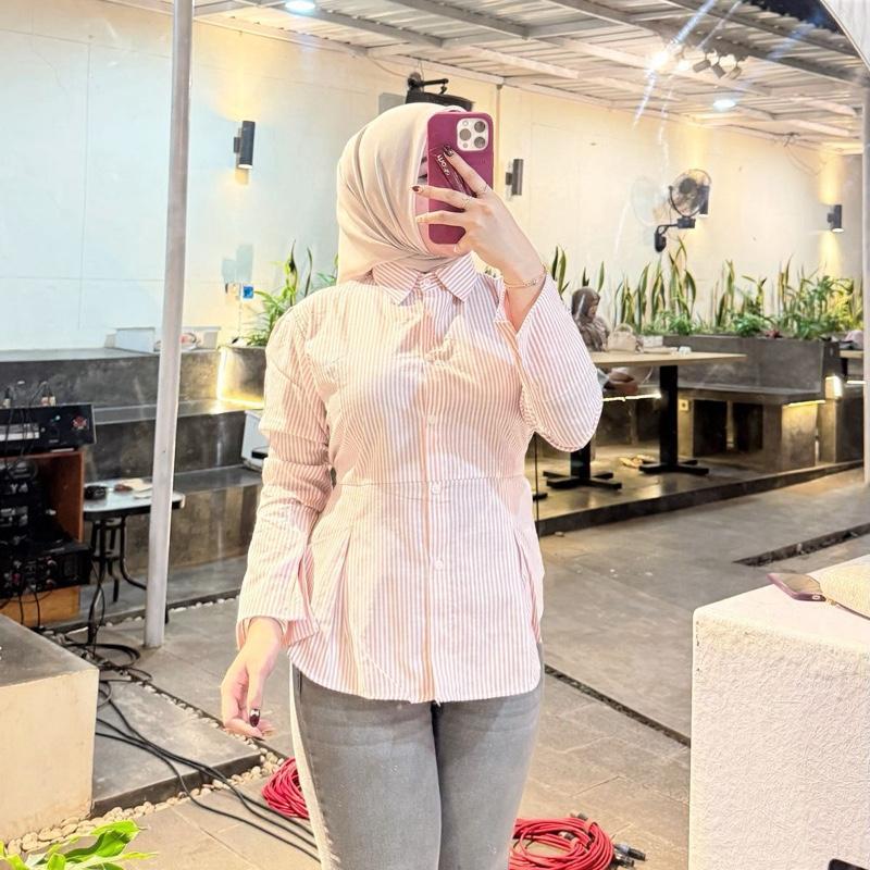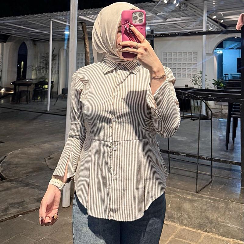 Blouse Stripe Rempel Korean Look Fitted Shirt - Atasan Wanita Stripe Salur - Kemeja Wanita Kantor Formal Casual Murah Gr