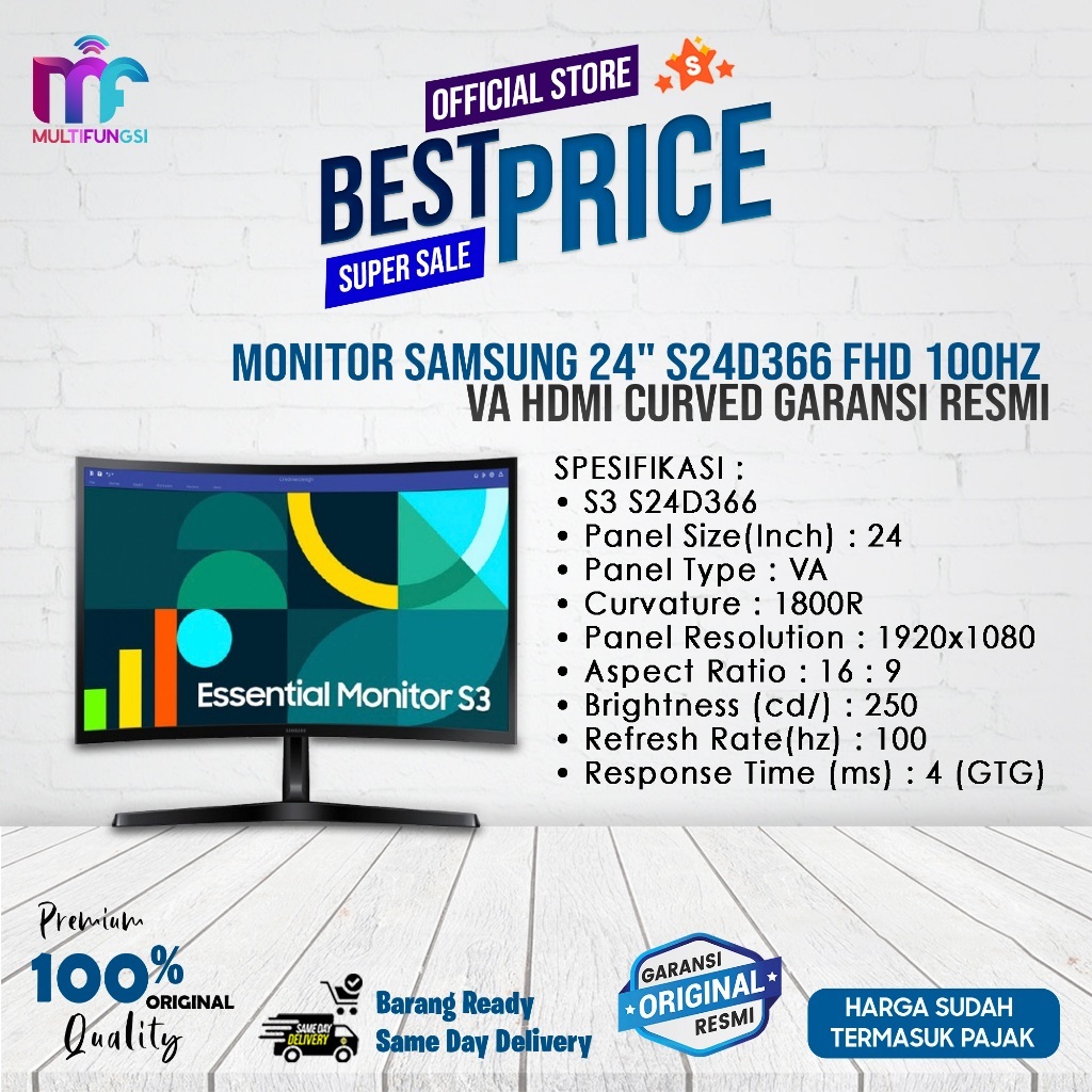 Monitor Samsung 24" S24D366 (Pengganti S24C366) FHD 100Hz VA HDMI Curved Garansi Resmi