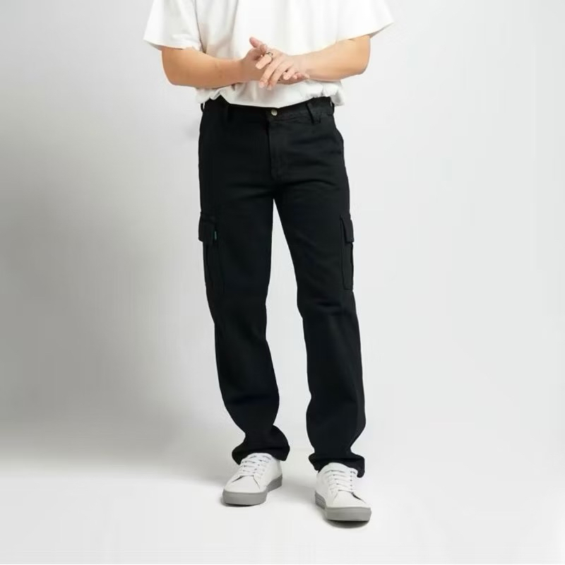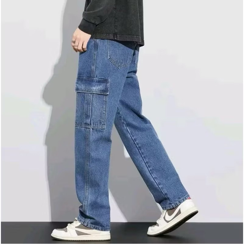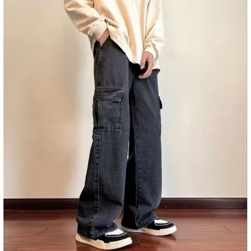 celana cargo panjang pria gombrong Korean style loose cargo pants blue jeans kulot pants denim cowok celana jeans cargo