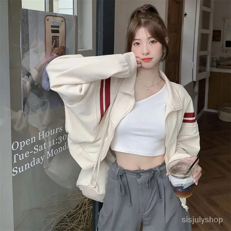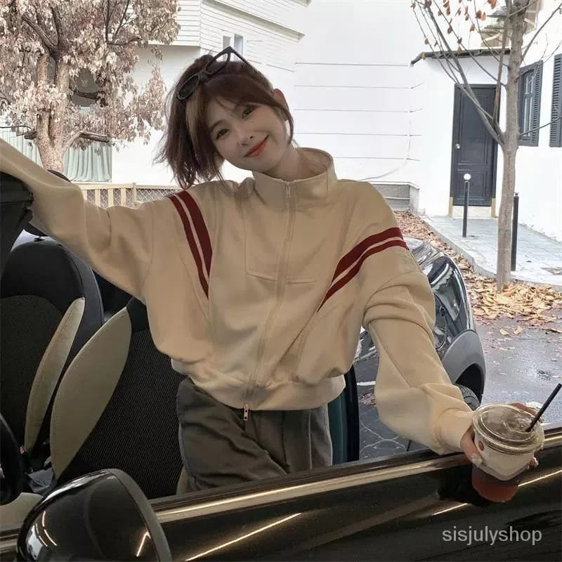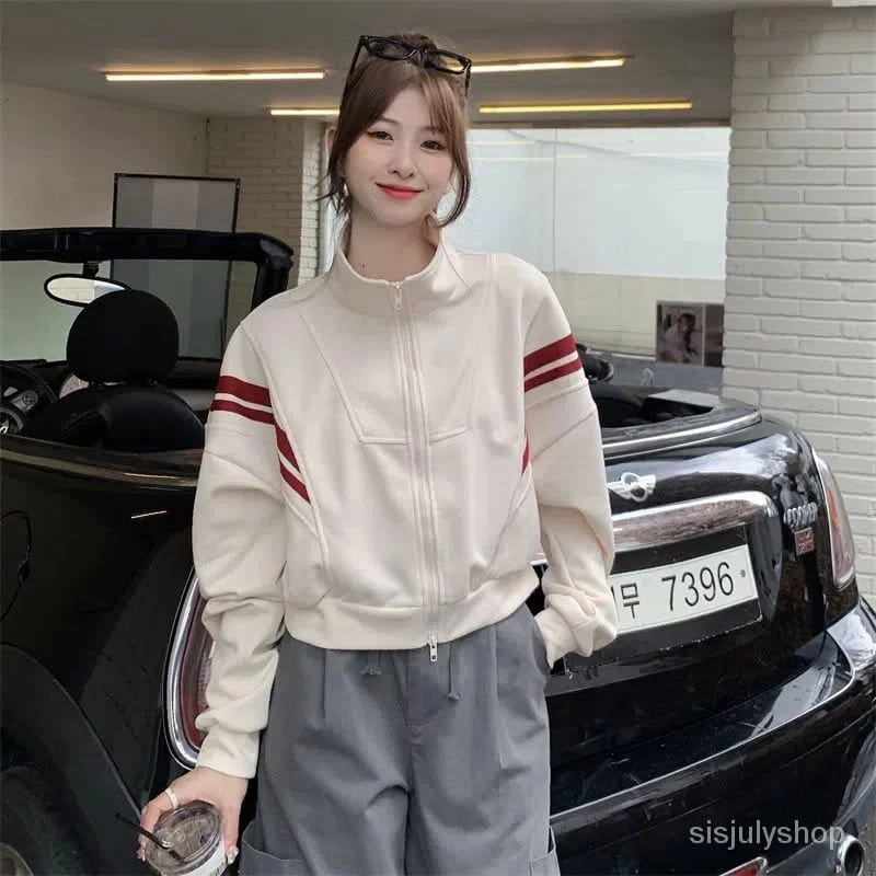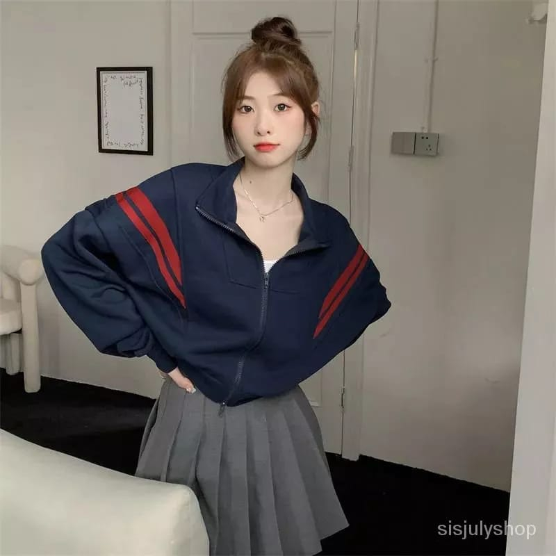 Floryn Stripe Jaket Ziper Crop Wanita Oversize Jaket Kekinian Fashion Outfit Ootd Korean Style Murah Gratis Ongkir
