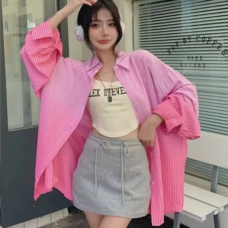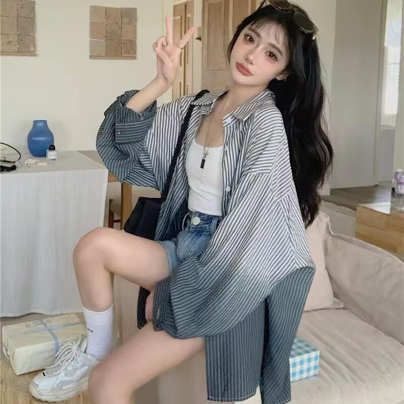Kemeja Wanita Garis-garis Gaya Korea Longgar Warna Gradien Atasan Kemeja Lengan Panjang Murah Gratis Ongkir