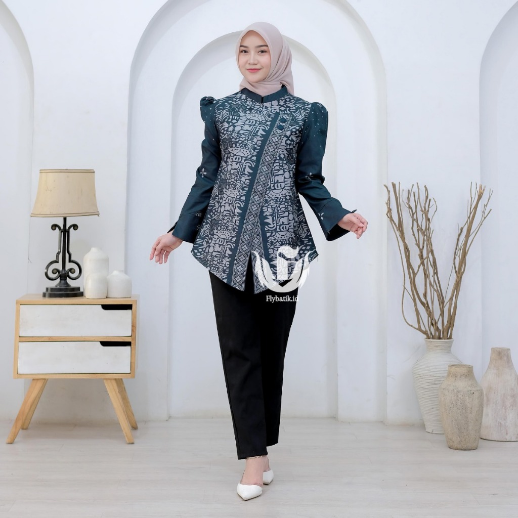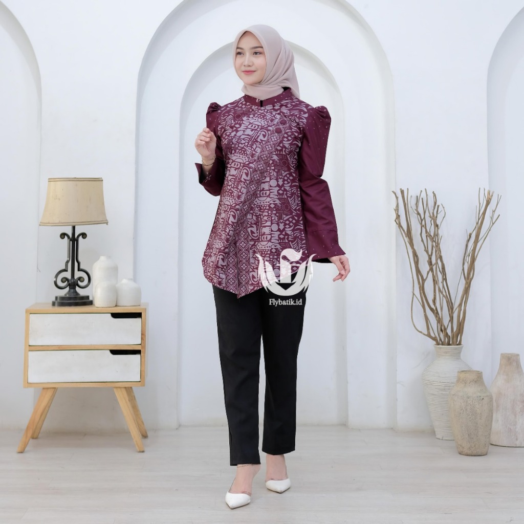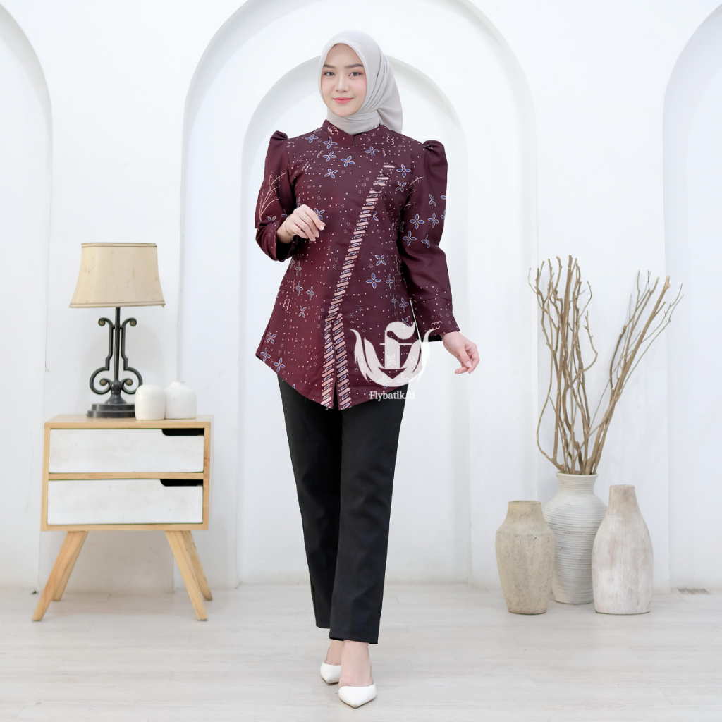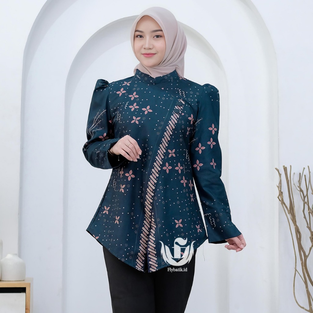 Flybatik.Id Atasan Baju Batik Wanita Modern Blouse Selempang Lengan Panjang Puffy Janggan M L Xl Xxl