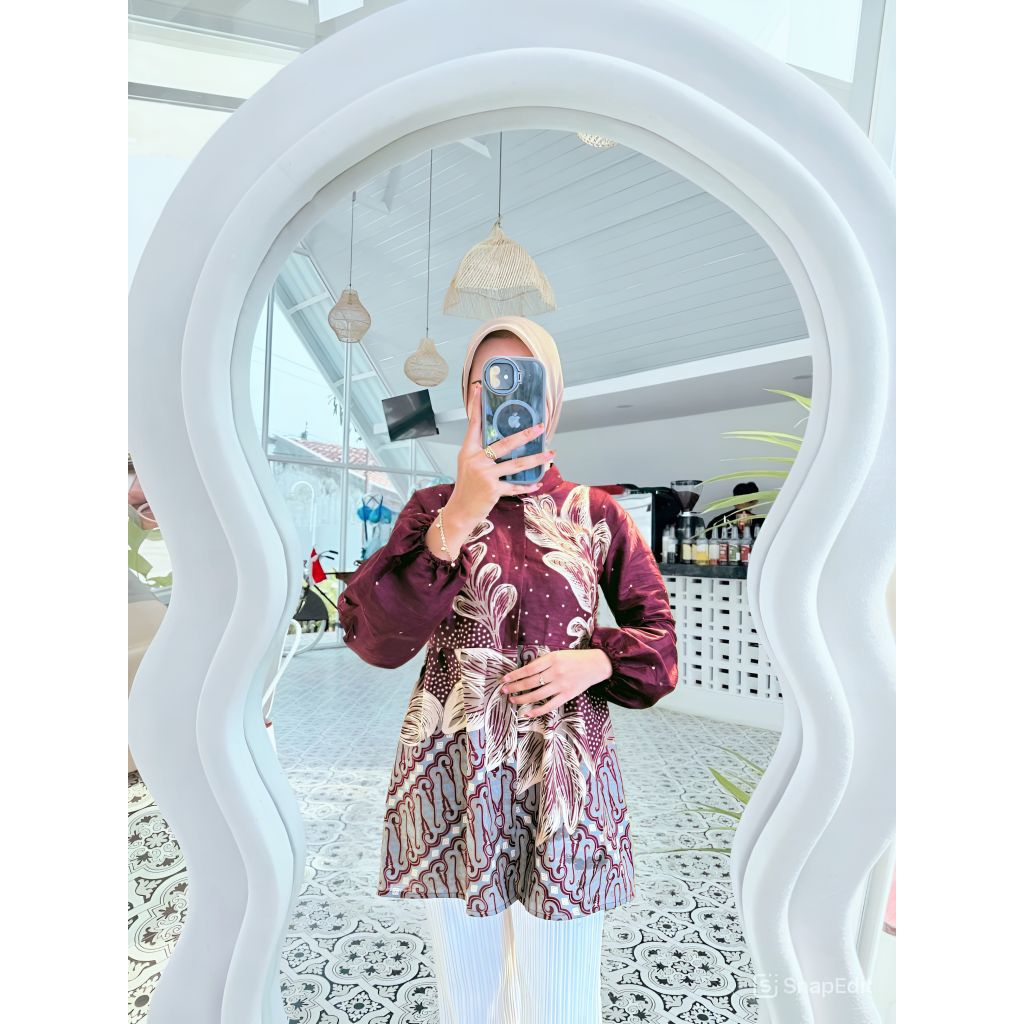 Blouse Batik Wanita Kerja Modern Motif Bunga Lengan Balon