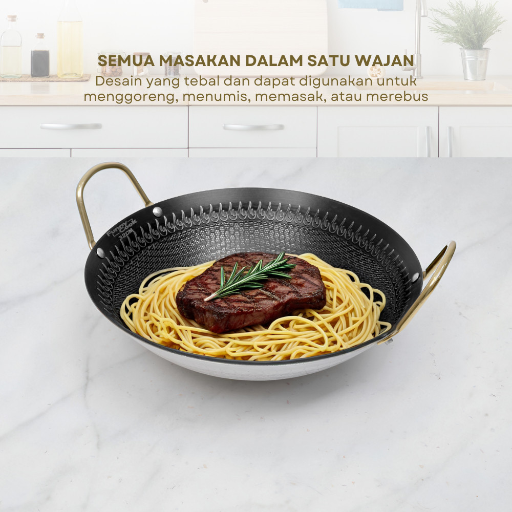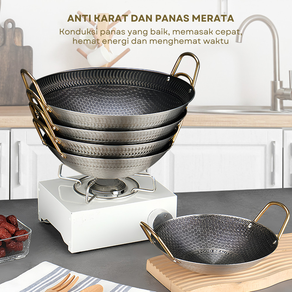 Wajan Corak Motif Stainless Steel 5 Ukuran Anti Lengket Tebal Gagang Gold Kuali Premium