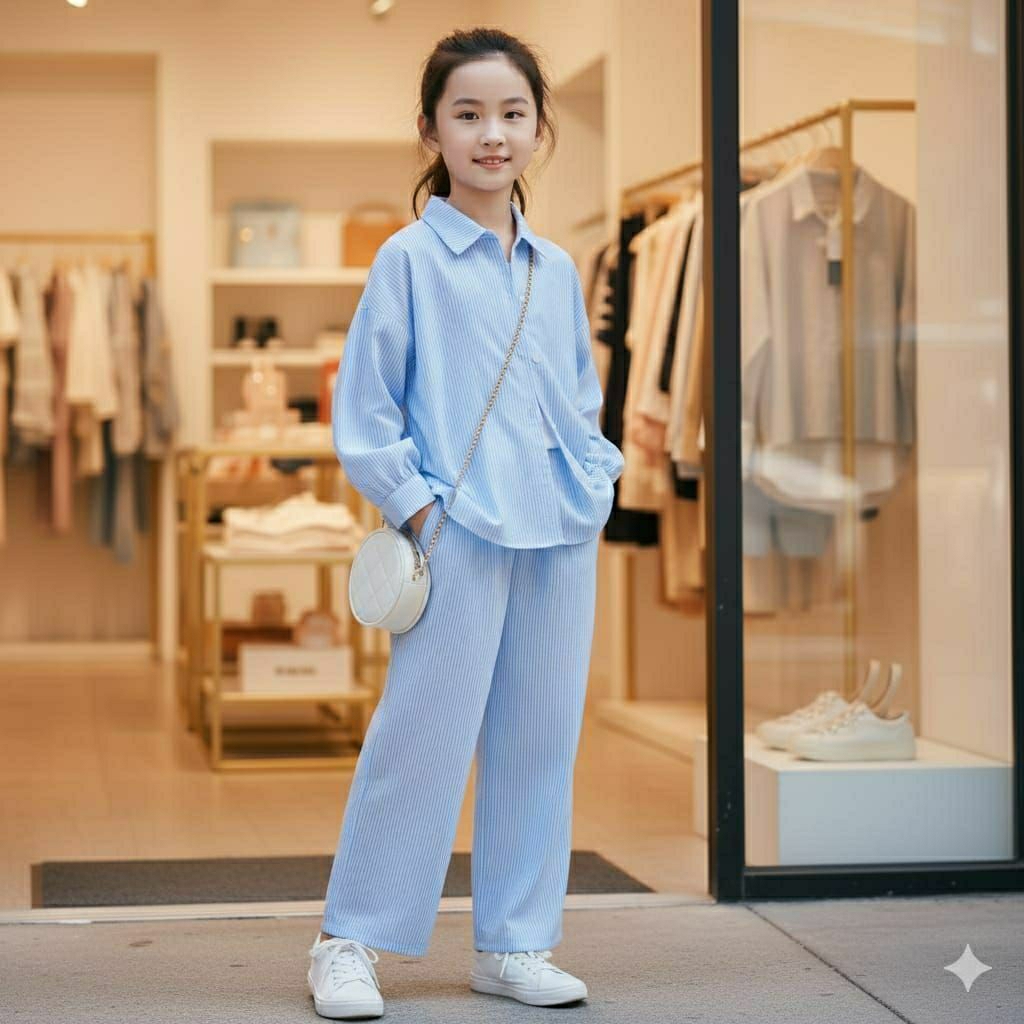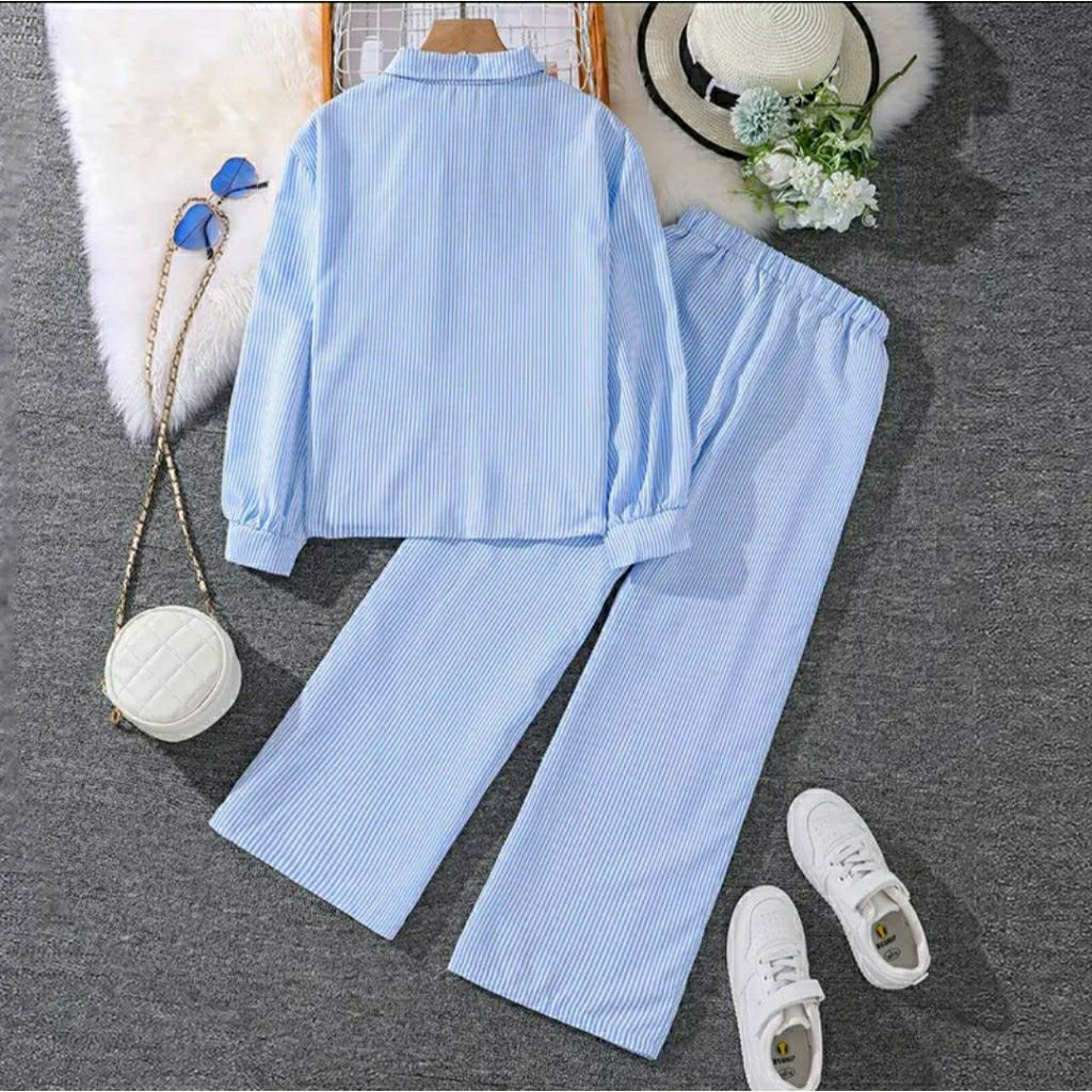 Setelan Salur Anak Perempuan 1-12 Tahun Baju Kemeja Tangan Panjang One Set Salur Premium