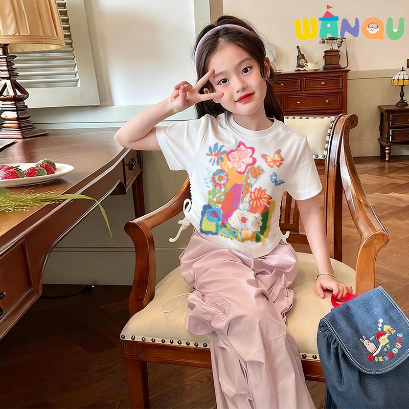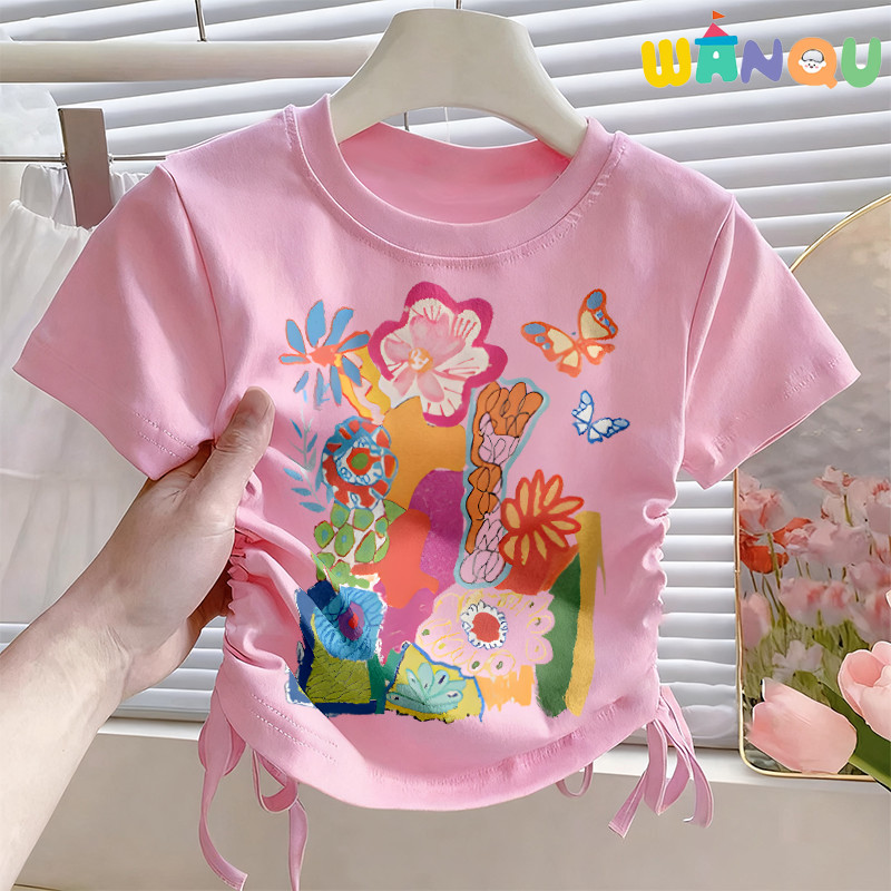 Wanqu Kaos Anak Perempuan 1-15 Tahun Import Imut-Imut 100 PERSEN Cotton Imut-Imut Bunga Dan Rumput Berwarna-Warni Kaus