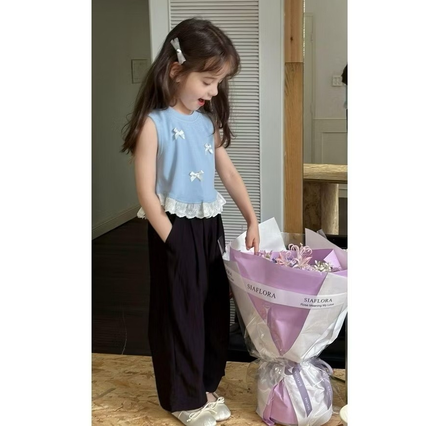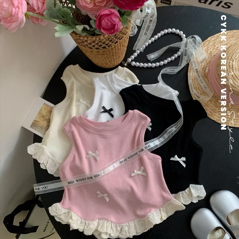 6B -6Tahun Baju Anak Perempuan Singlet Atasan Tank Top Dengan Aksen Pita Timbul Dan Aksen Renda Bawah Bahan