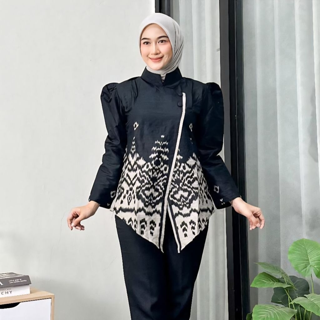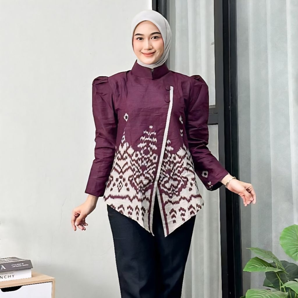 Blouse Batik Wanita Muslim Burgundy Puff Aena – Atasan Kerjakantor Modis