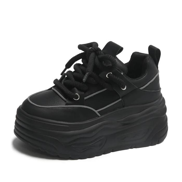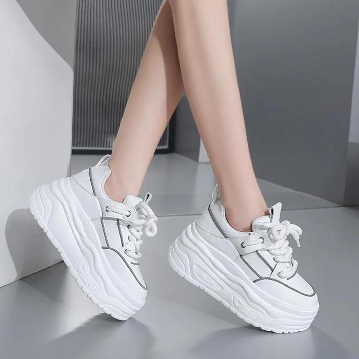 8CM HIGH HEEL LEATHER WOMEN SHOES CHUNKY SNEAKERS AUTUMN WEDGE PLATFORM SHOES SPRING WOMEN BREATHABLE COMFY SKATEBOARD FOOTWEAR - WHITE, 39