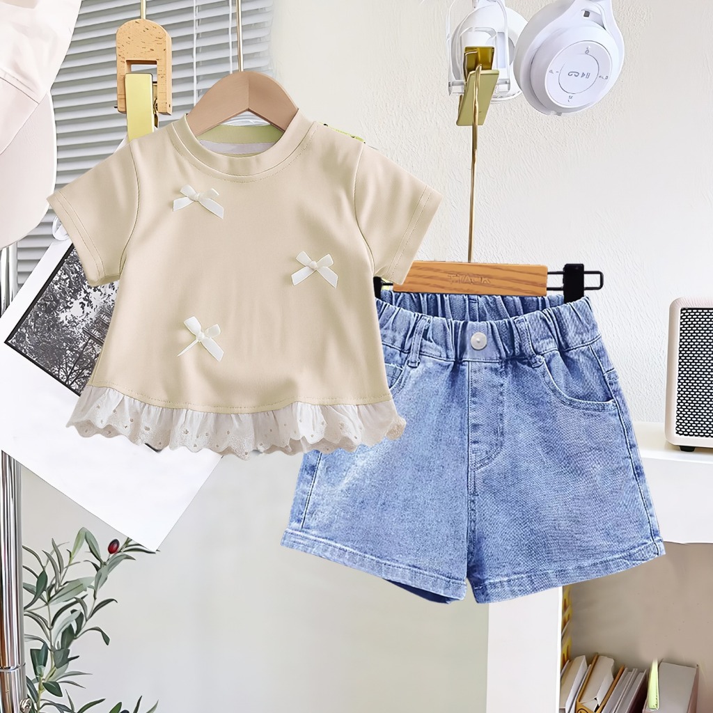 Setelan Anak Perempuan Kaos Pita Renda & Celana Pendek Jeans Lucu Usia 1 2 3 4 5 6 7 8 9 10 11 12 Tahun