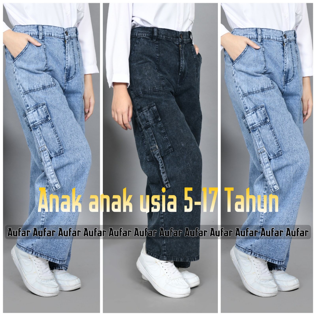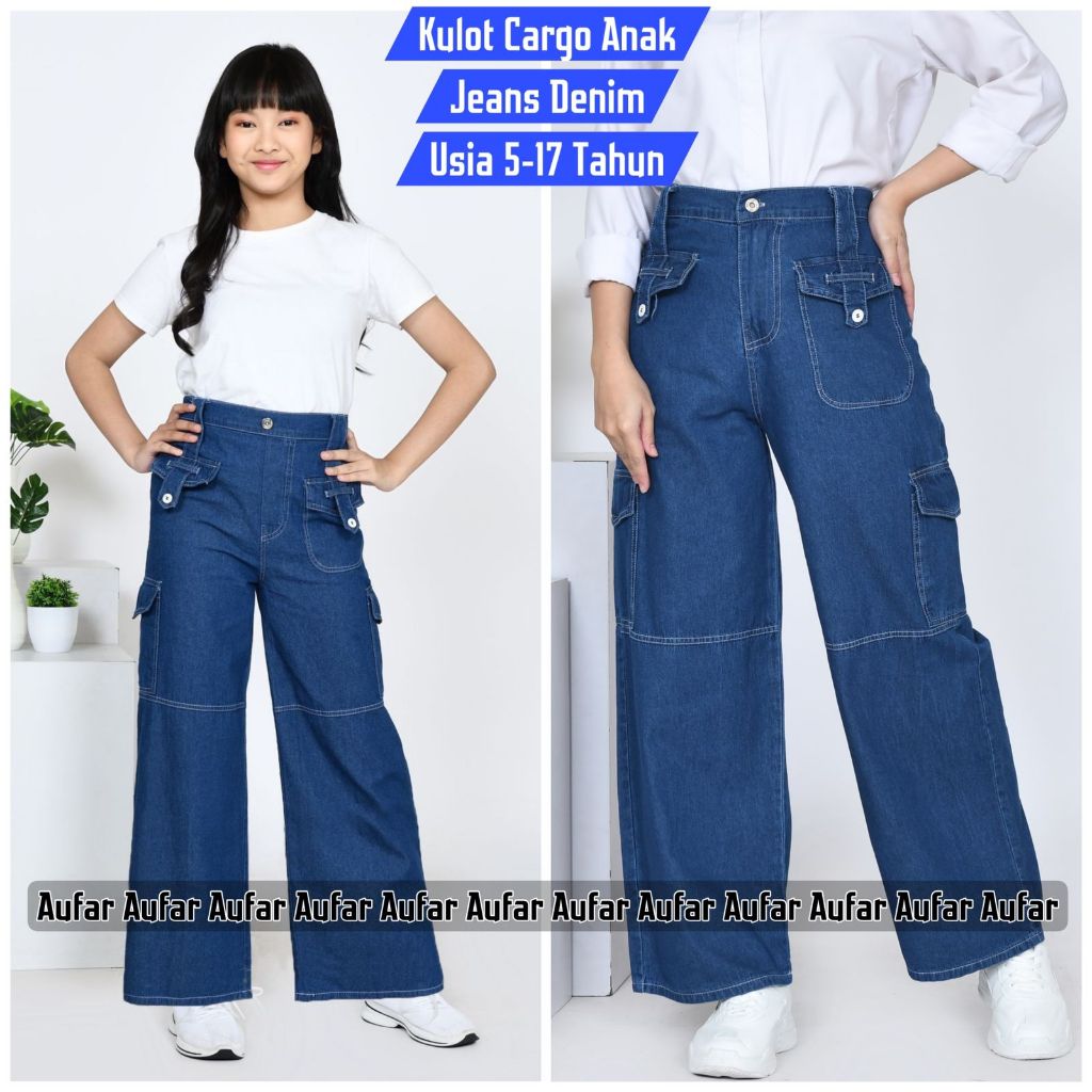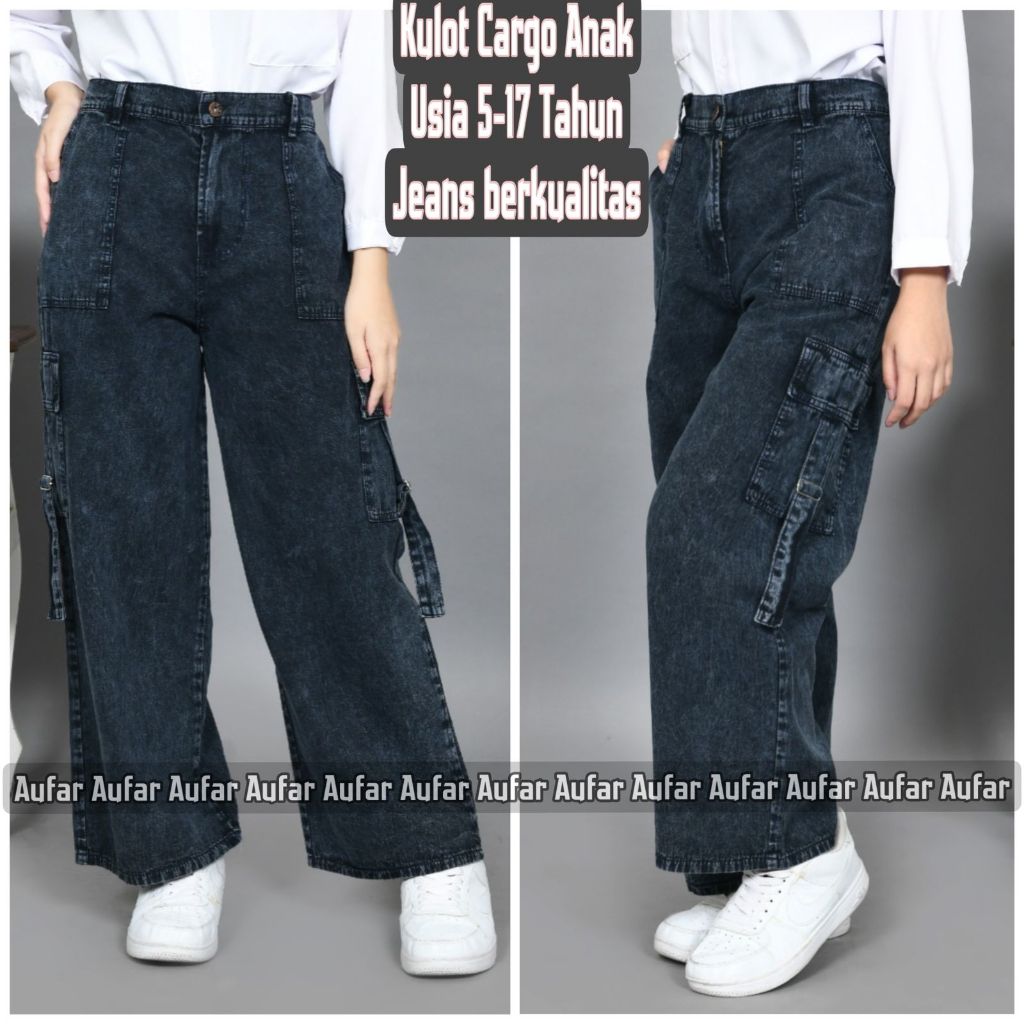 Celana Kulot Jeans Cargo Anak Perempuan Saku Samping Usia 1-17 Tahun
