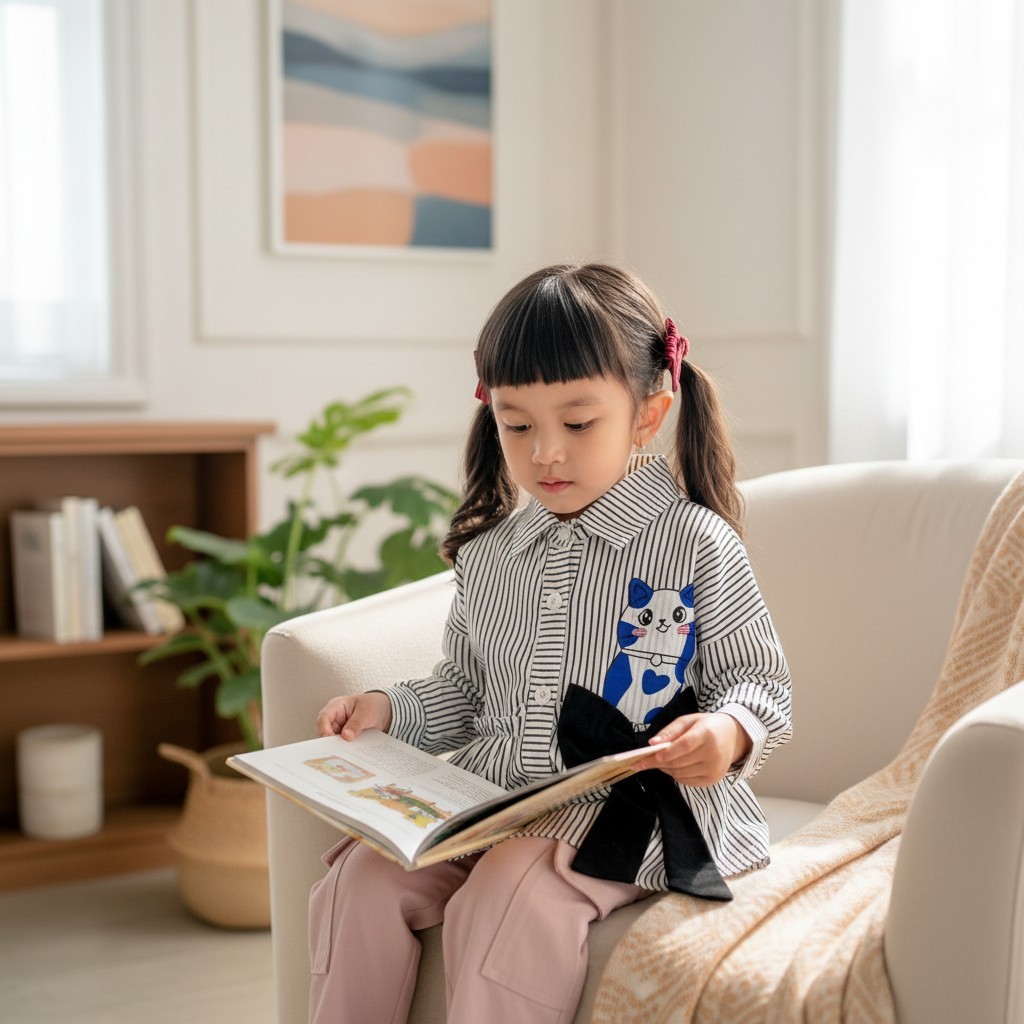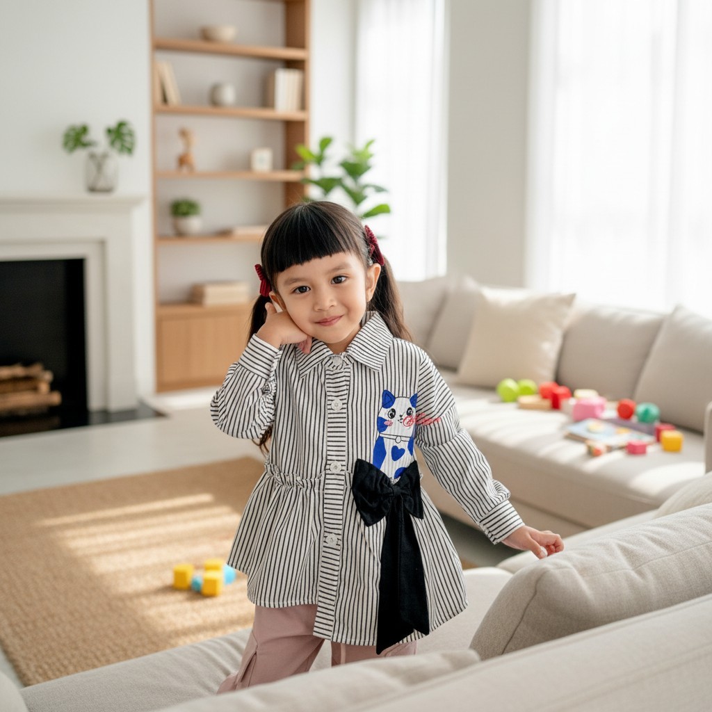 Kemeja Miaw Anak Perempuan Bahan Katun Salur Dengan Motif Kucing Lucu Dan Pita Fashion