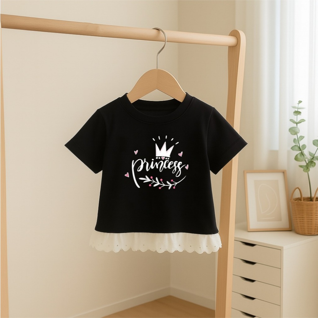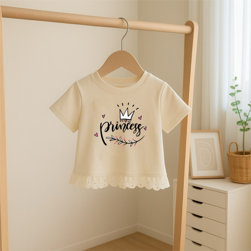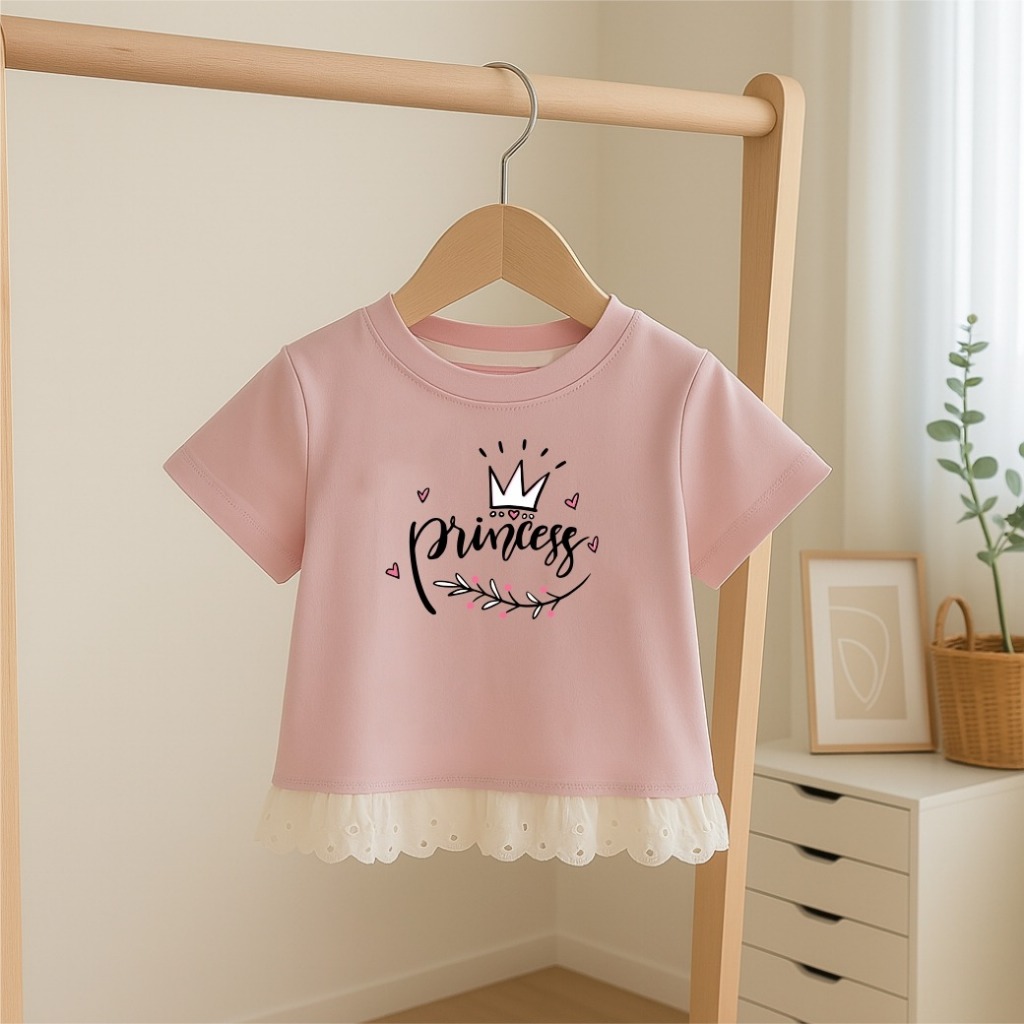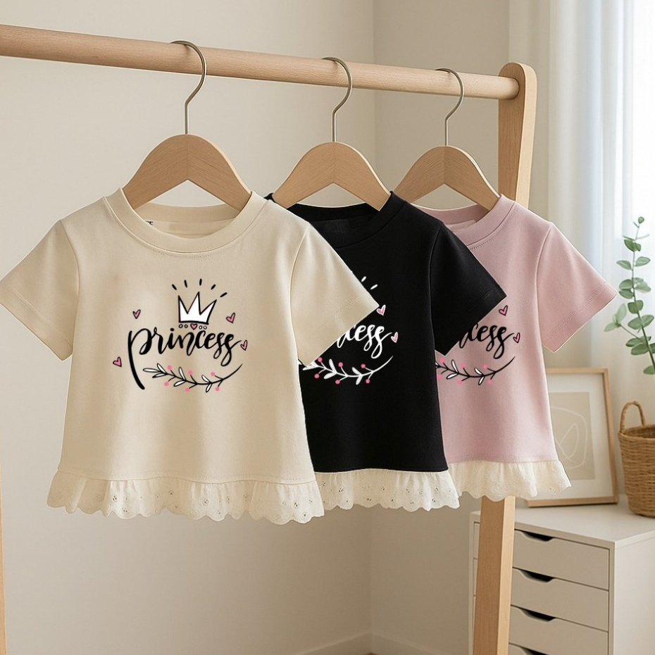 Kaos Anak Perempuan Usia 1-12 Tahun Lengan Pendek Motif Princess Lucu Renda Bawah – Baju Atasan Cewek Warna Cream Pink H