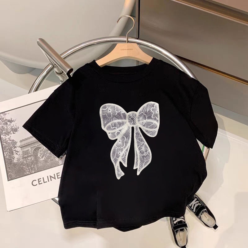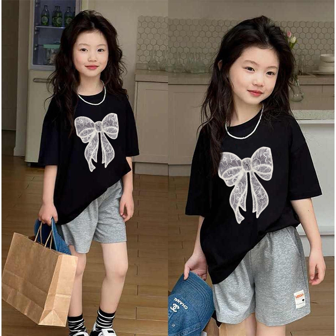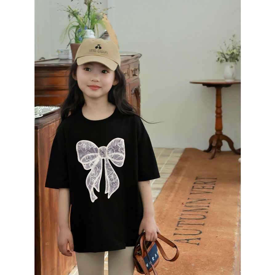 Kaos Anak|Cewek 10 Tahun Import|2-12 Tahun|Kaos Cetakan Pita Renda Yang Lucu|Cetakan Gaya Korea|Korea Style Premium Baju