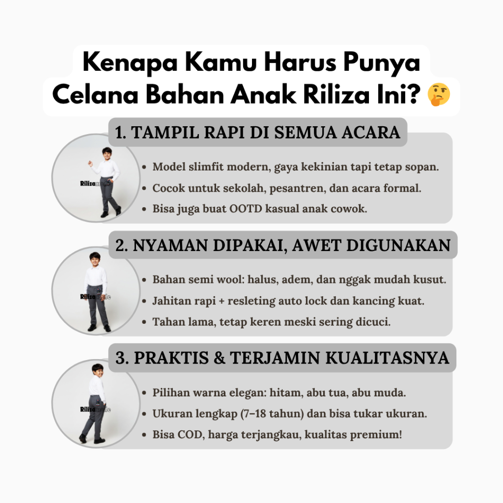 Celana Panjang Anak Laki Laki Formal Slimfit 7-18 Tahun Sd Smp Sma Bahan Kain Semi Wool Riliza