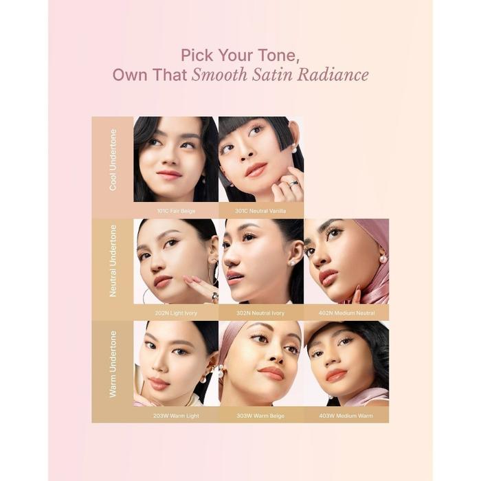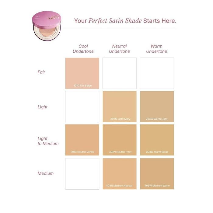 101C Fair Beige , 202N Light Ivory , 203W Warm Light, 301C Neutral Vanilla , 302N Neutral Ivory , 303W Warm Beige, 402N Medium Neutral , 403W Medium Warm