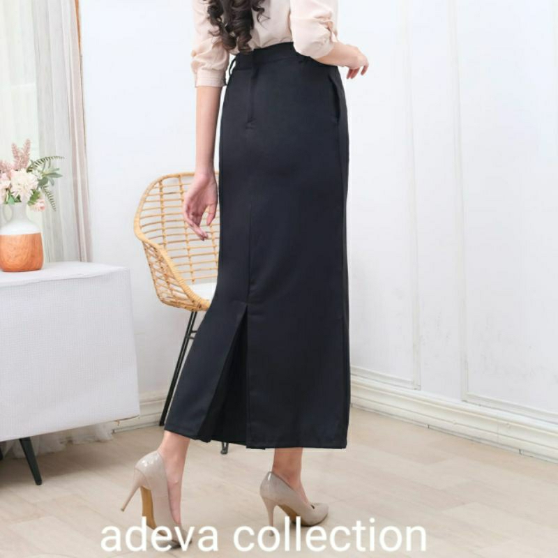 Rok Span Kerja Wanita Panjang Kantor Hitam Rempel Bawah pinggang karet samping