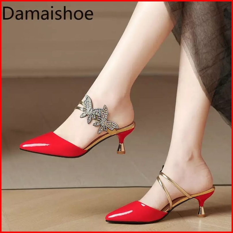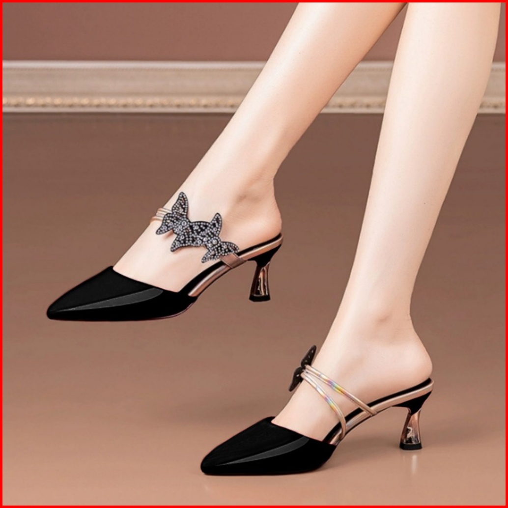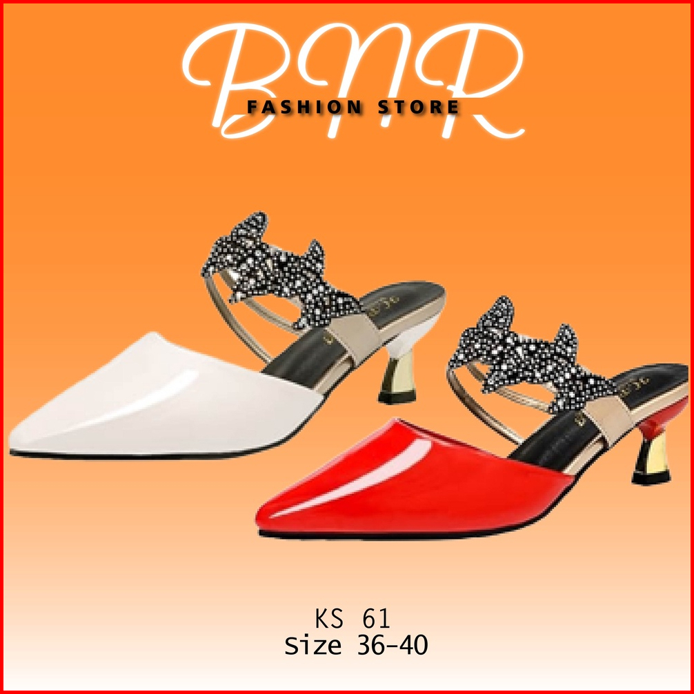 Sendal Heels Wanita Hak Stiletto Bahan Sintetis Glossy Variasi Kupu- Kupu Manik Tempel Ks 61