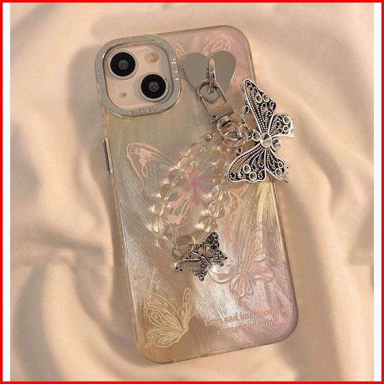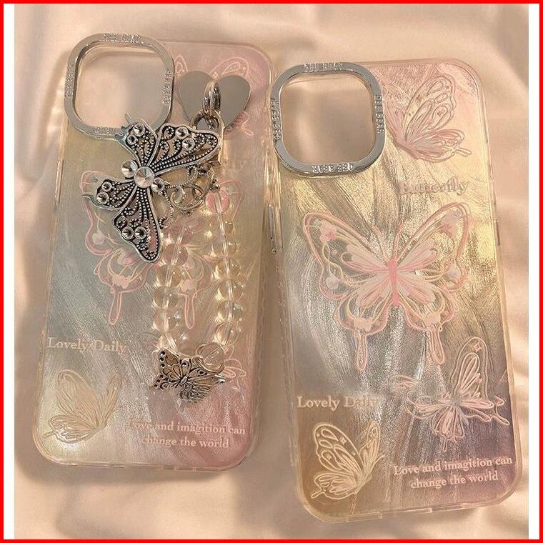 New Lovely Daily Pink Butterfly Textured Feather Hologram With Charm Case Iphone-hardcase Casing Hp Compatible For Iphon