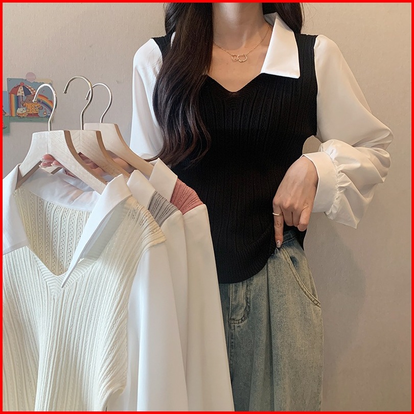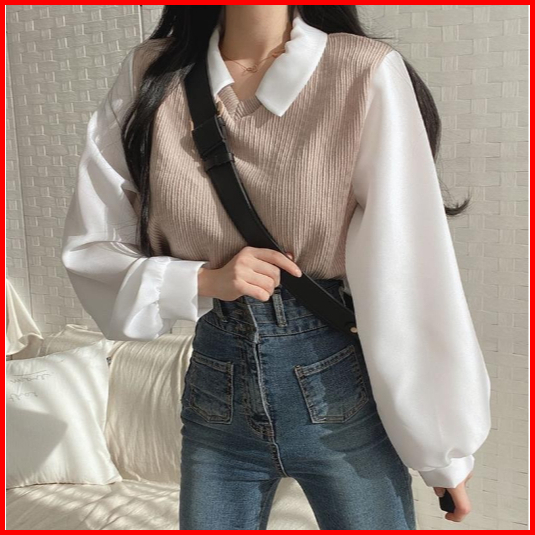 Rsb Bj442 Blouse Rib Knit Wanita Korean Style Kemeja Sweater Lengan Panjang