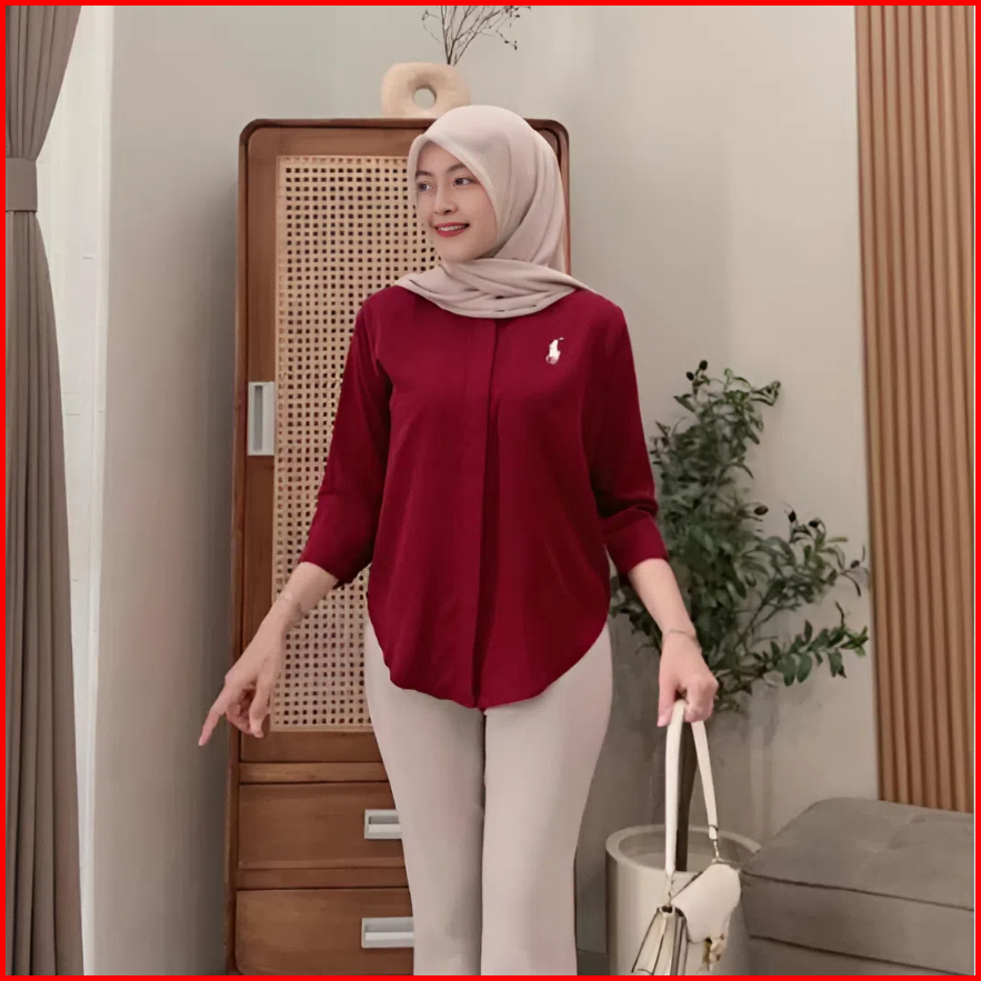 Atasan Kemeja Wanita Bordir Logo Kuda Rayon Twill Lengan 7 8 Kerah Sanghai Kualitas Terbaik