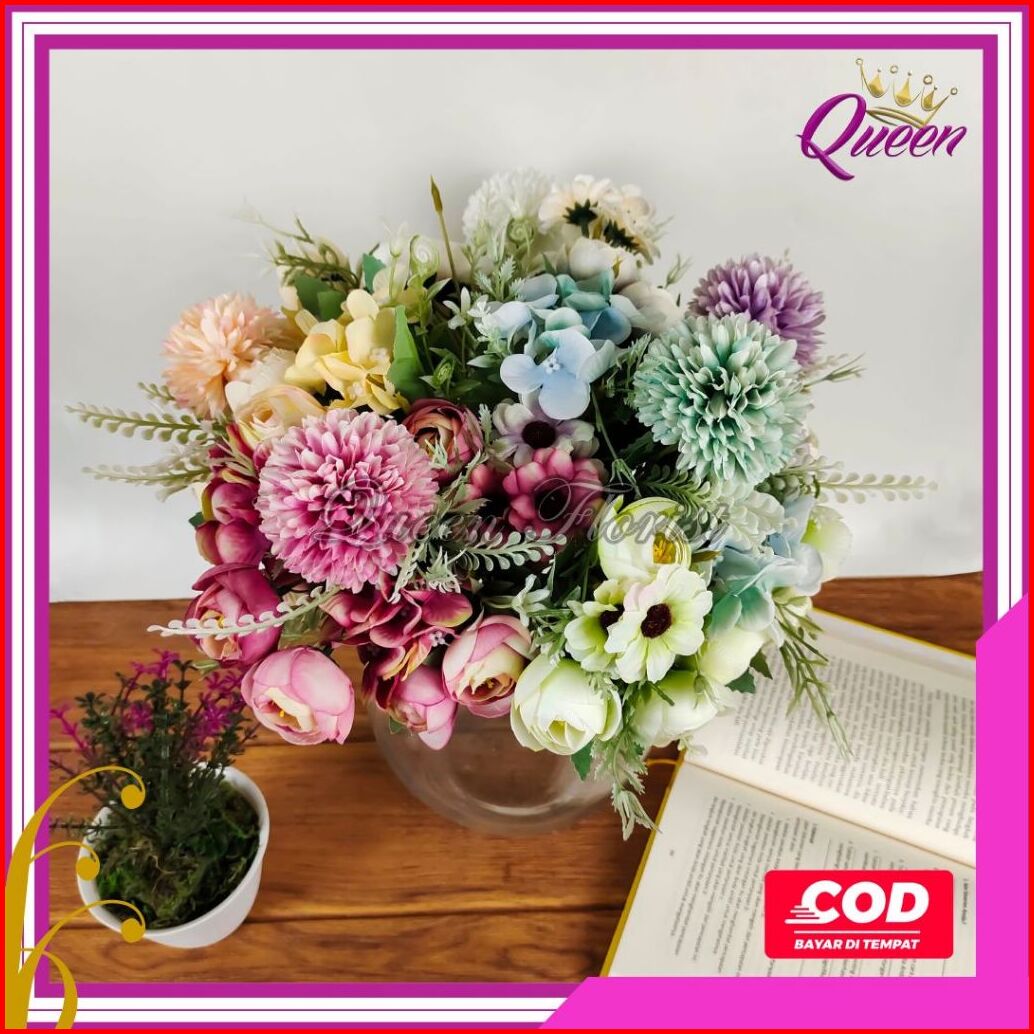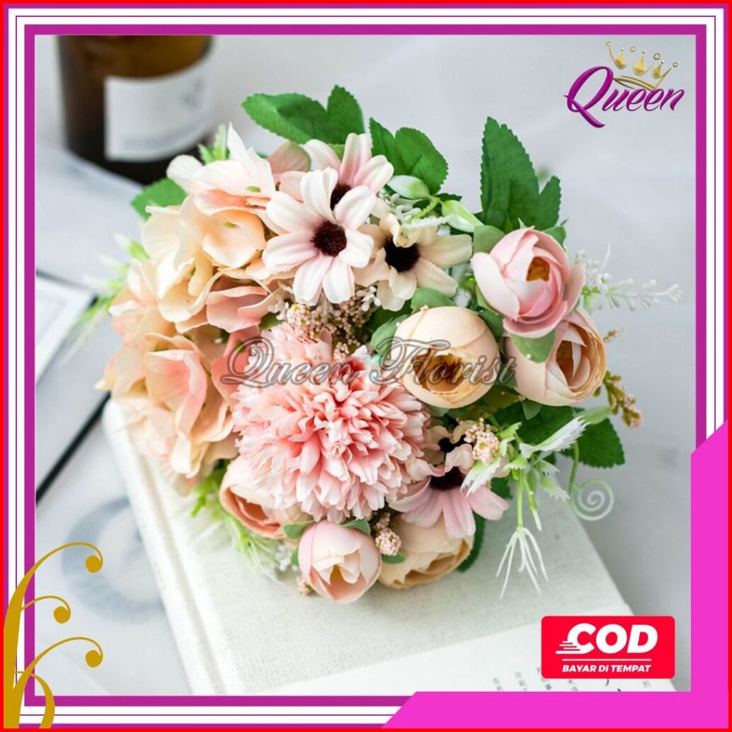 Bunga Peony Mix Cabang 7 Campur Artificial Peony Aster Pompom Aksesoris Dekorasi Buatan Kain Plastik Hiasan Meja Premium