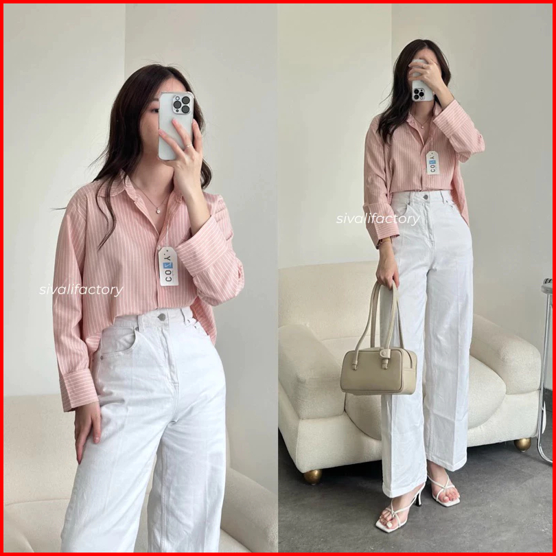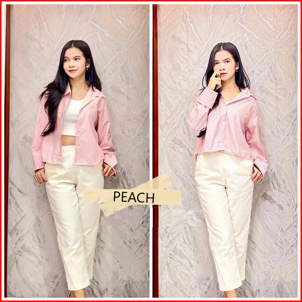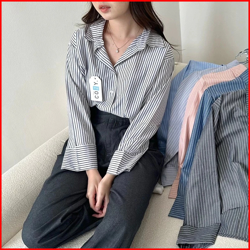 Ziggy Top Stripe Shirt - Kemeja Salur Garis Oversized Crop Shirt Atasan Wanita Lengan Panjang Fashion