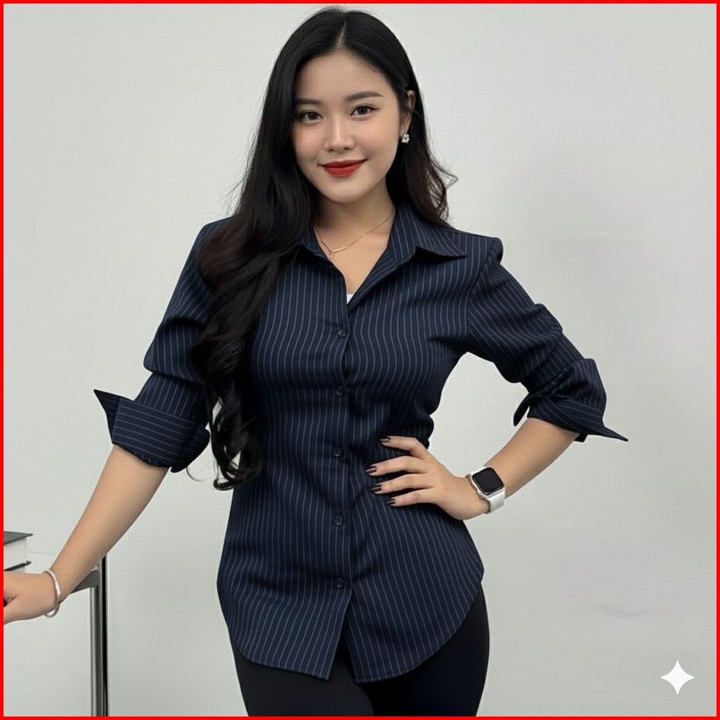 Kemeja Wanita Luna Stripe Lengan Panjang Atasan Casual Formal Kekinian