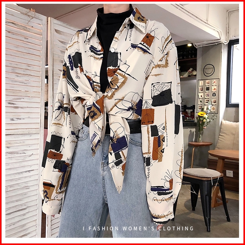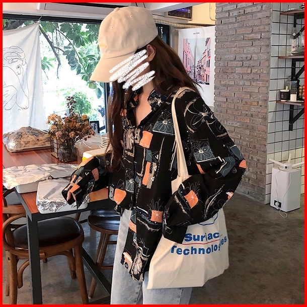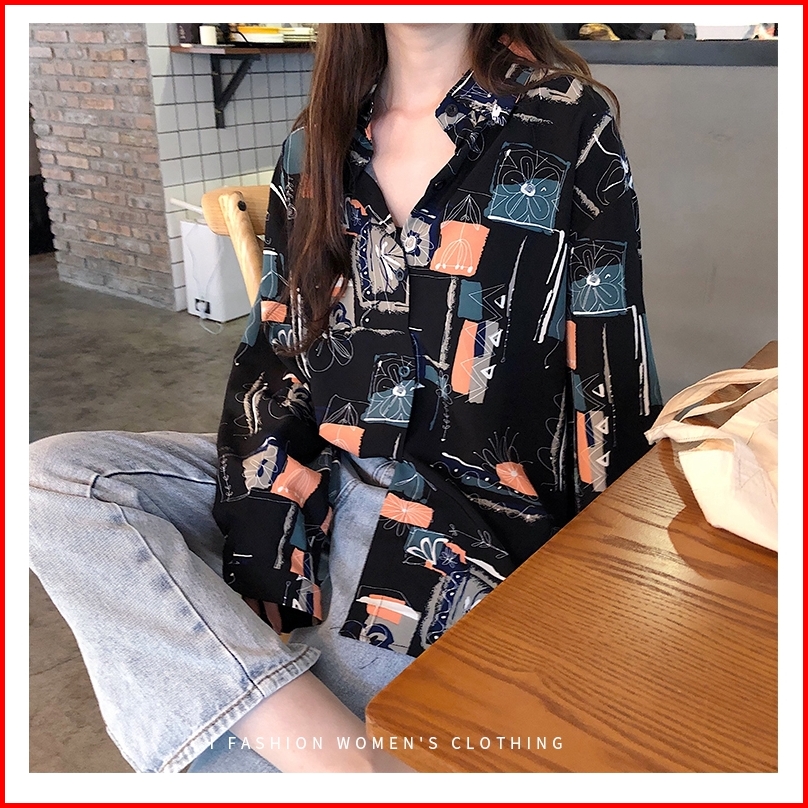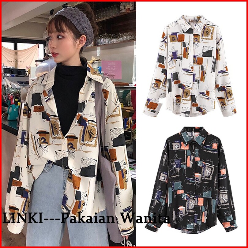 Yikoo-korean Print Kemeja Lengan Panjang Longgar Atasan Wanita Shirt Top