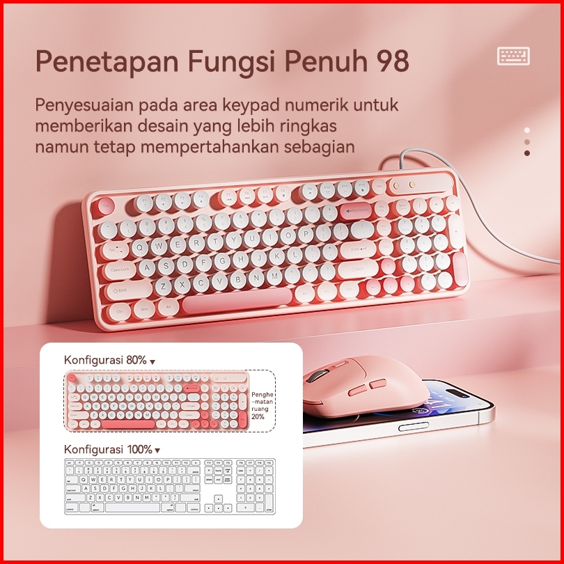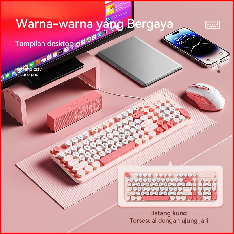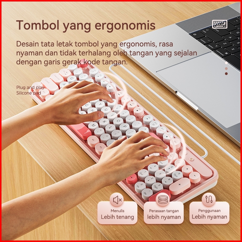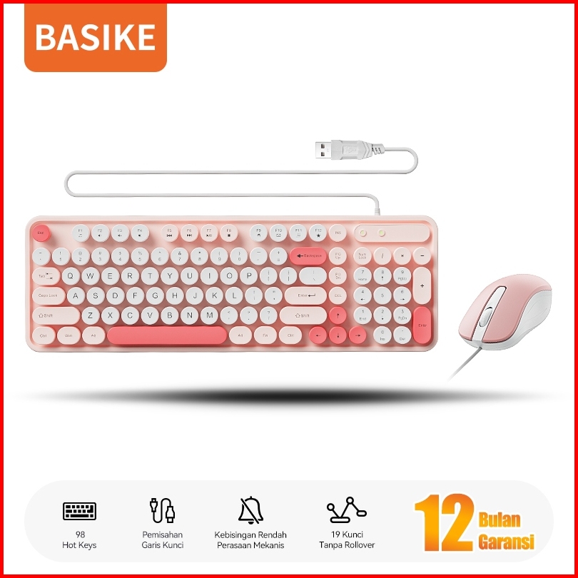 Basike Keyboard Mouse 1 Set Wired Kabel Usb Silent Click Pink Office For Laptop Komputer Tablet Asli