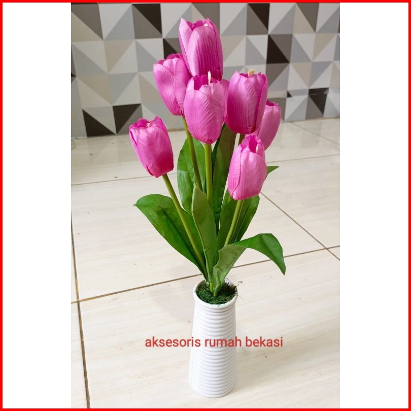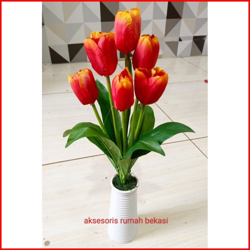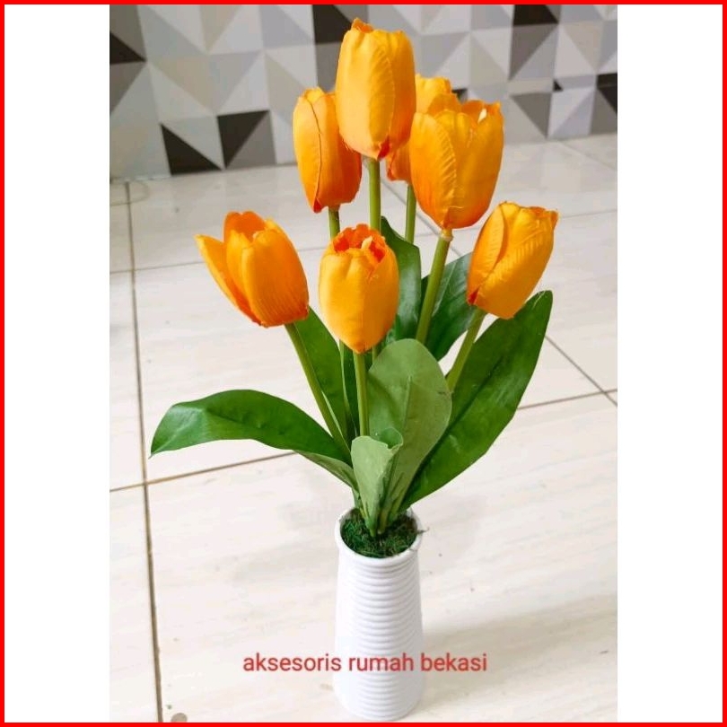 Bunga Tulip Artificial 7 Tangkai Dengan Pot Melamin Ulir Tinggi
