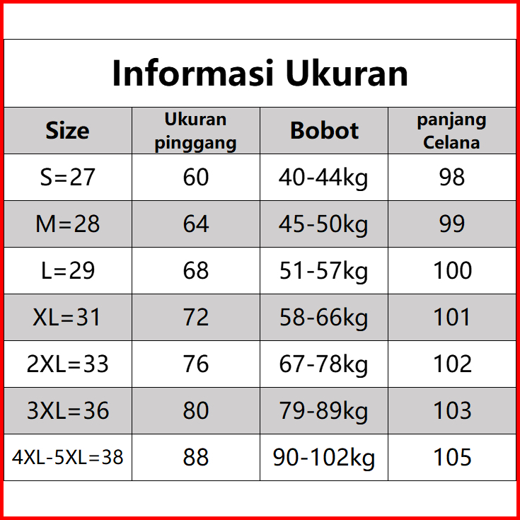 S=27(40-44kg), M=28(45-50kg), L=29(51-57kg), XL=31(58-66kg), 2XL=33(67-78kg), 3XL=36(79-89kg), 4XL-5XL=38(90-102kg)